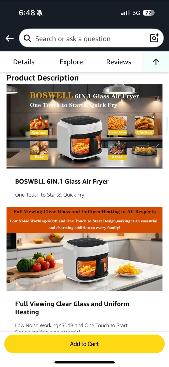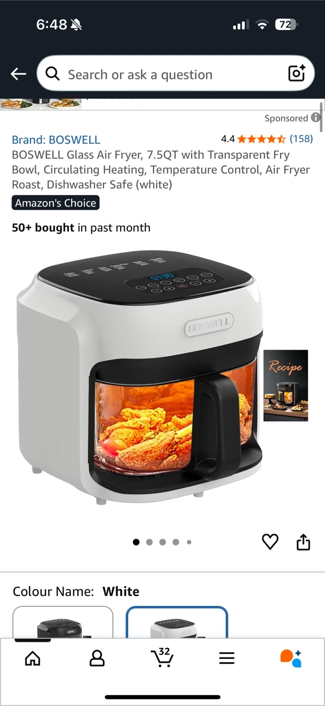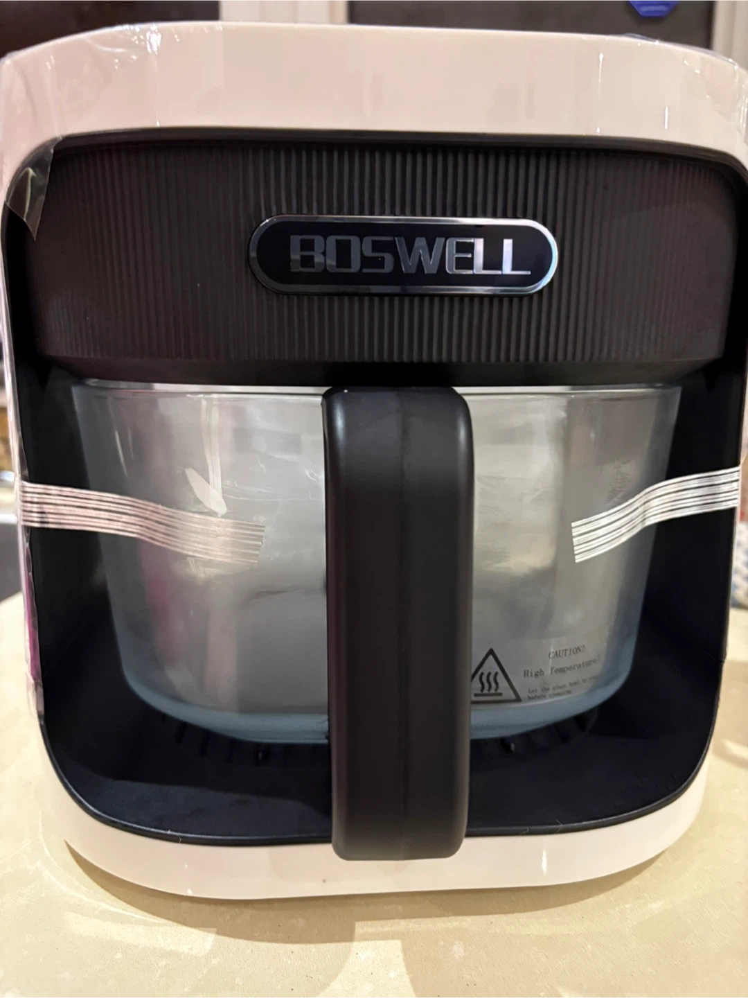 Selling a Boswell glass air fryer with a 7.5QT capacity. It features a transparent fry bowl and temperature control. This air fryer is dishwasher safe and makes cooking easy!