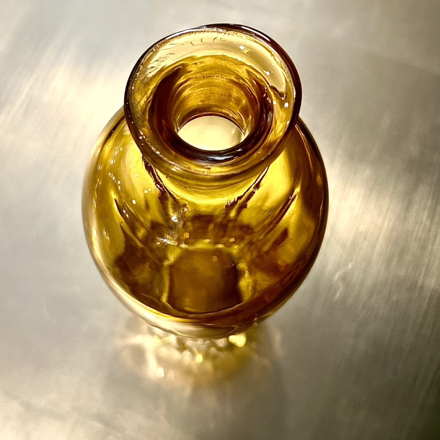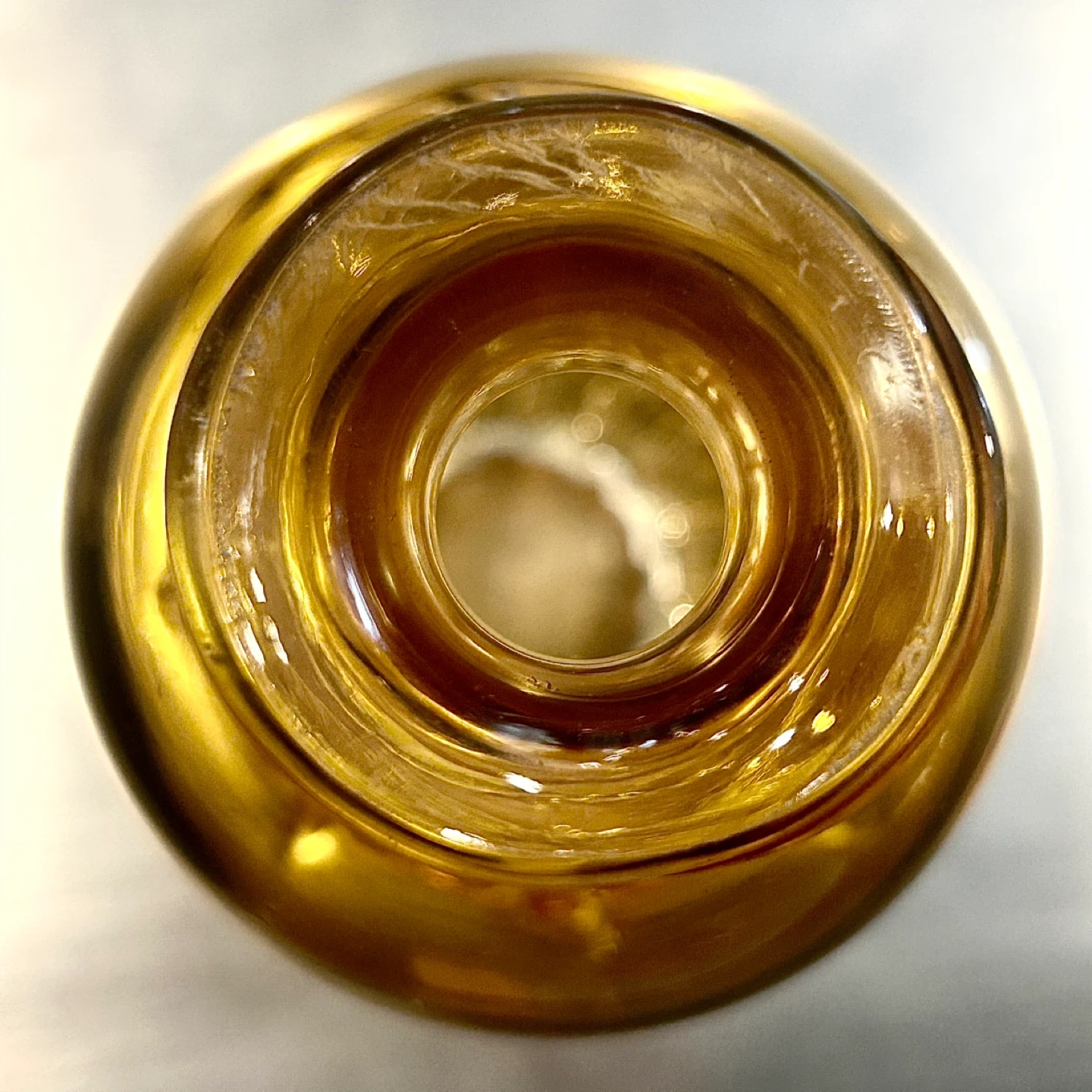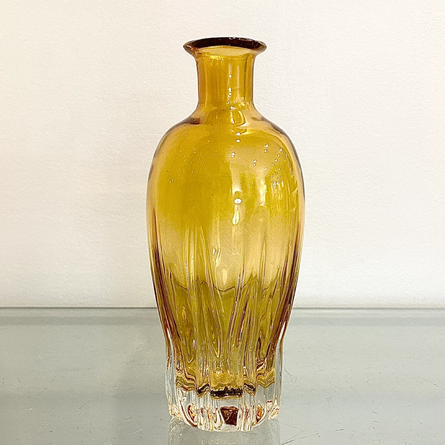 The glass exhibits a warm honey-to-amber hue that deepens toward the lower body, a hallmark of early continental production.