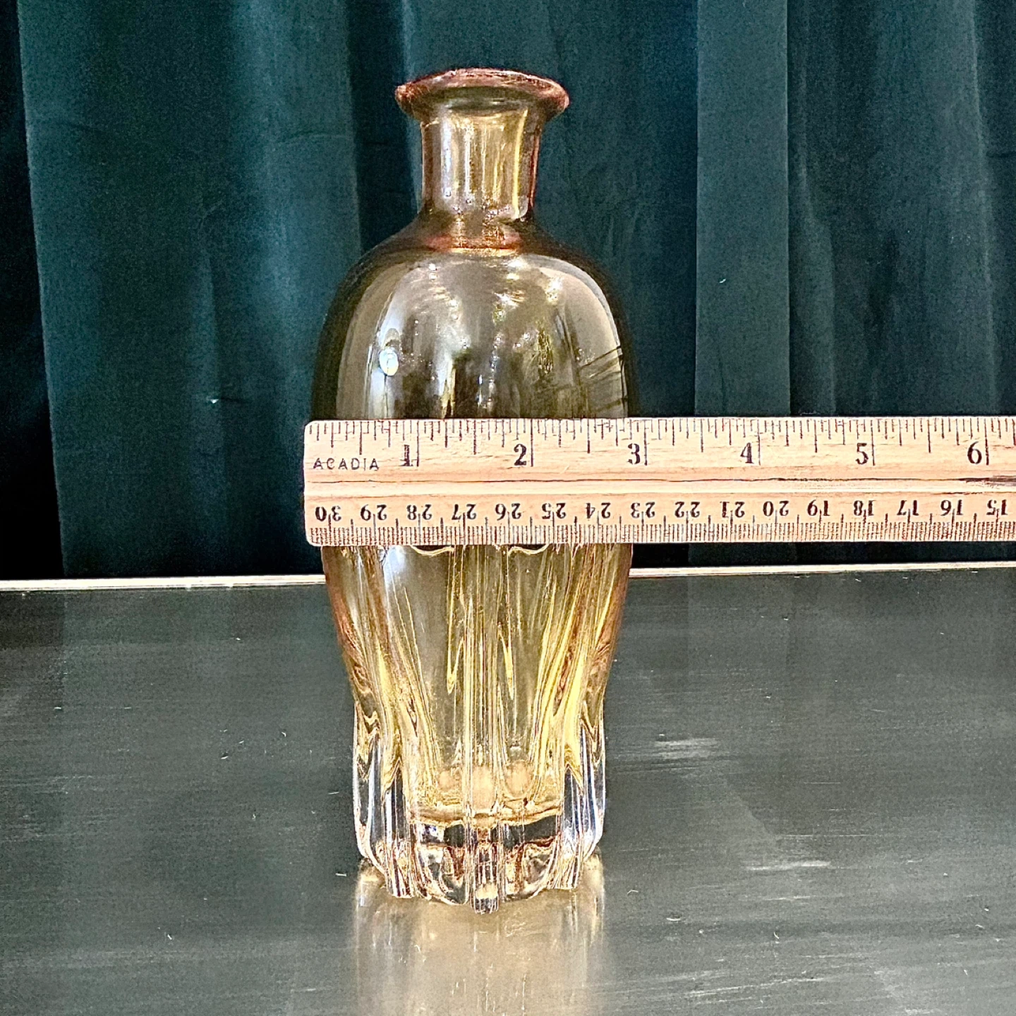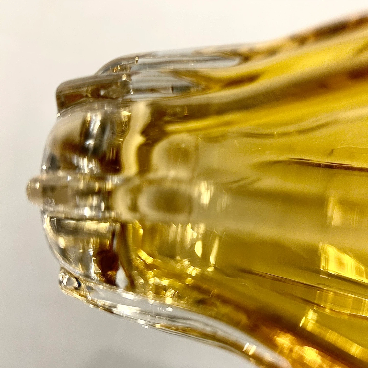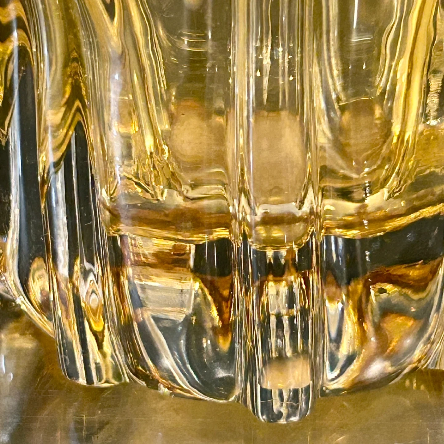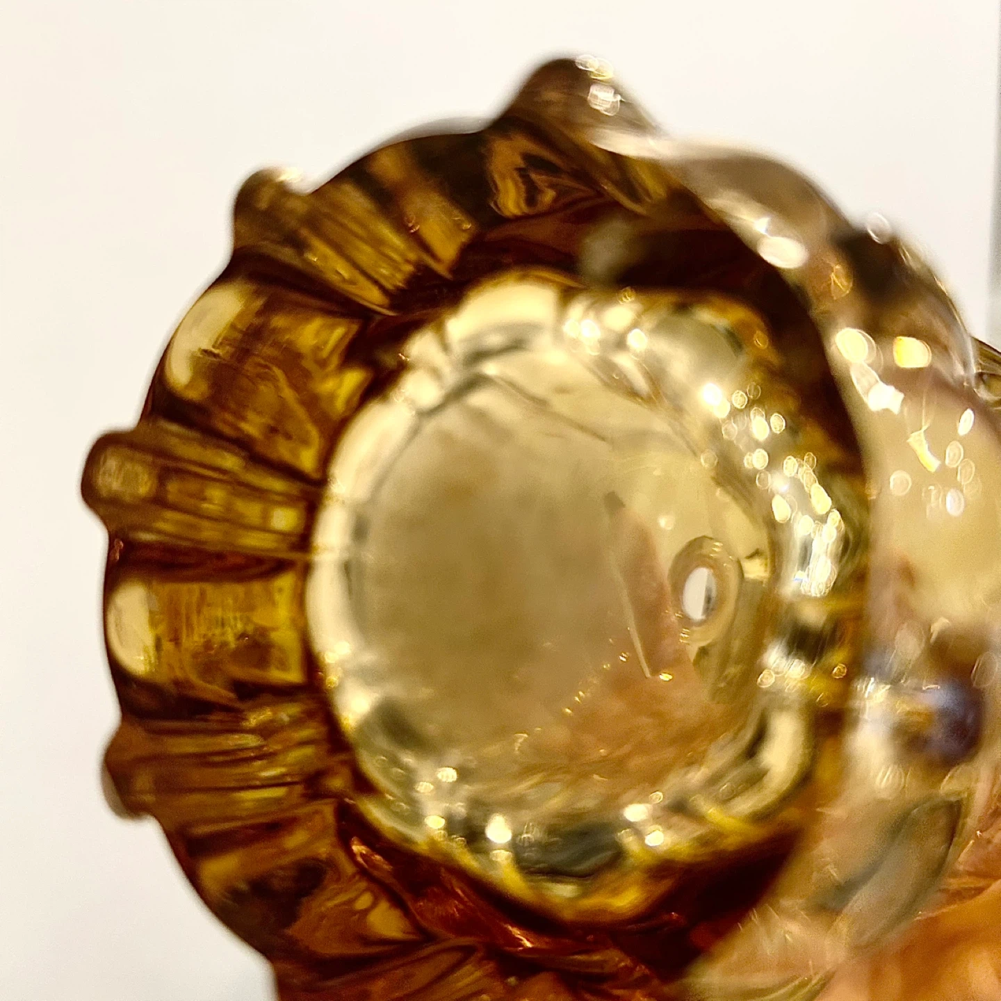 • Pressed glass, heavy and well-saturated amber tone