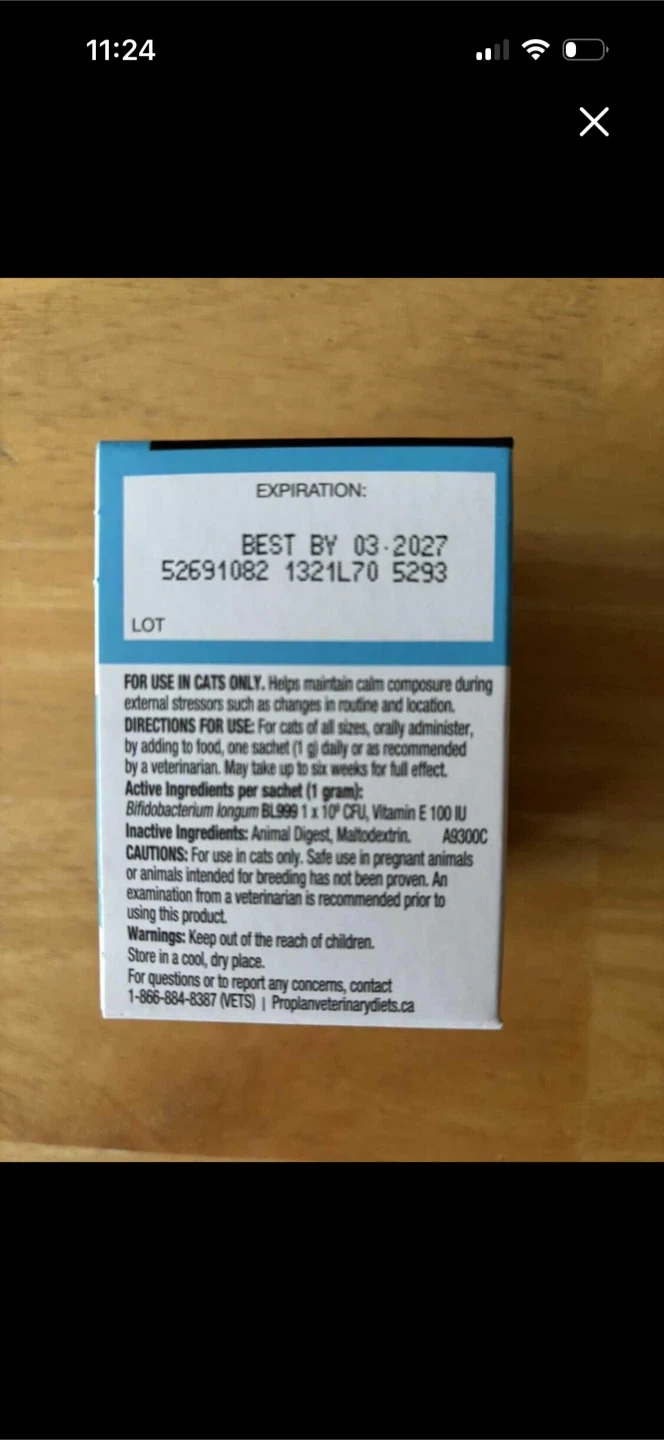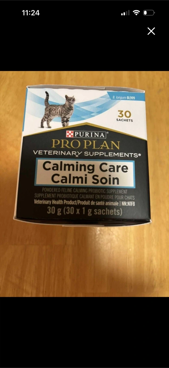 Selling a brand new box of Purina Pro Plan Veterinary Supplements Calming Care for cats. These are powdered feline calming probiotic supplements. Expiry date is March 2027. Each box contains 30 sachets (30 x 1g sachets). Helps maintain calm composure during external stressors in cats.