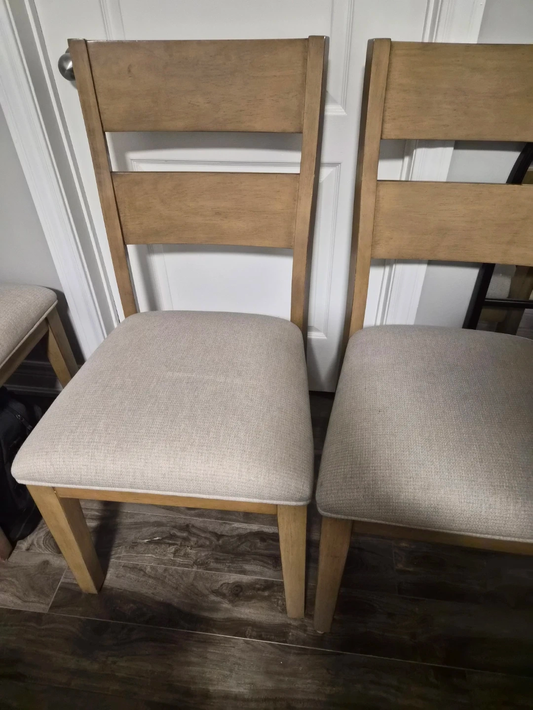 Selling a set of six dining chairs. They have a light wood frame and neutral-coloured fabric seats. Perfect for adding a touch of simple elegance to your dining area!