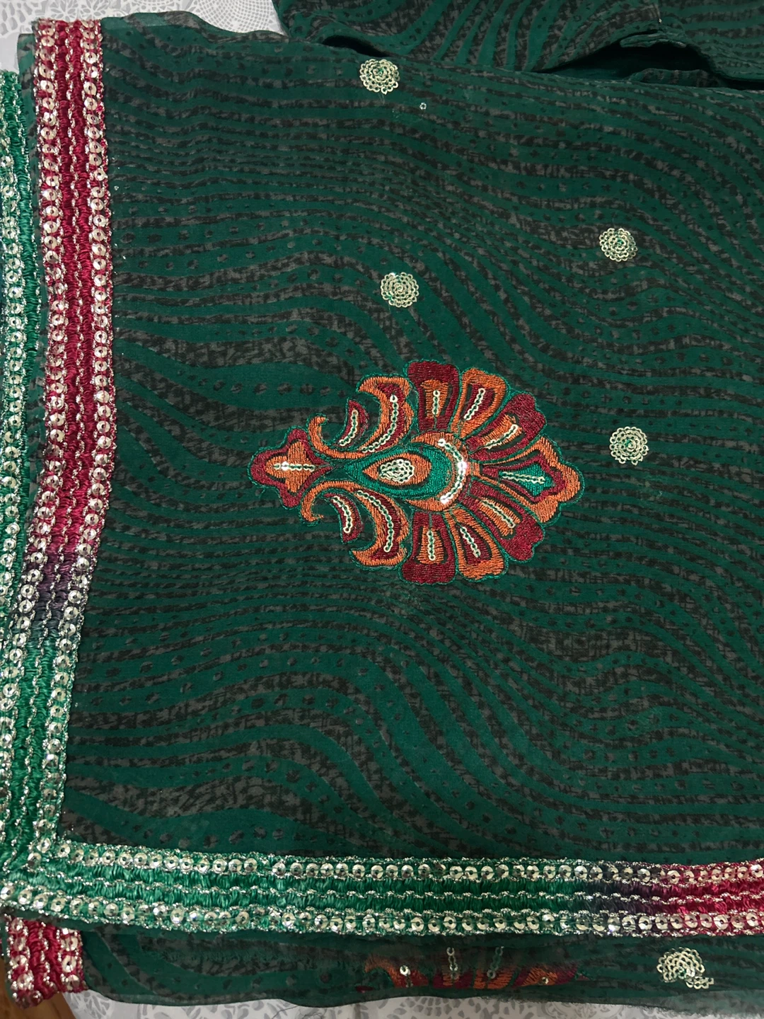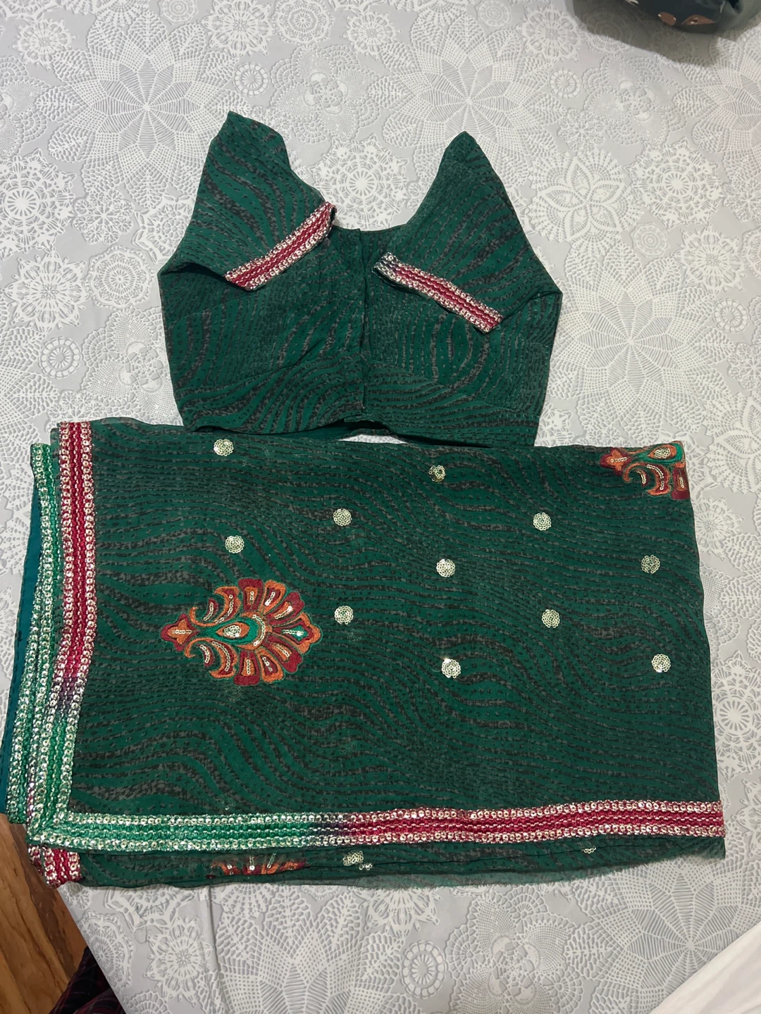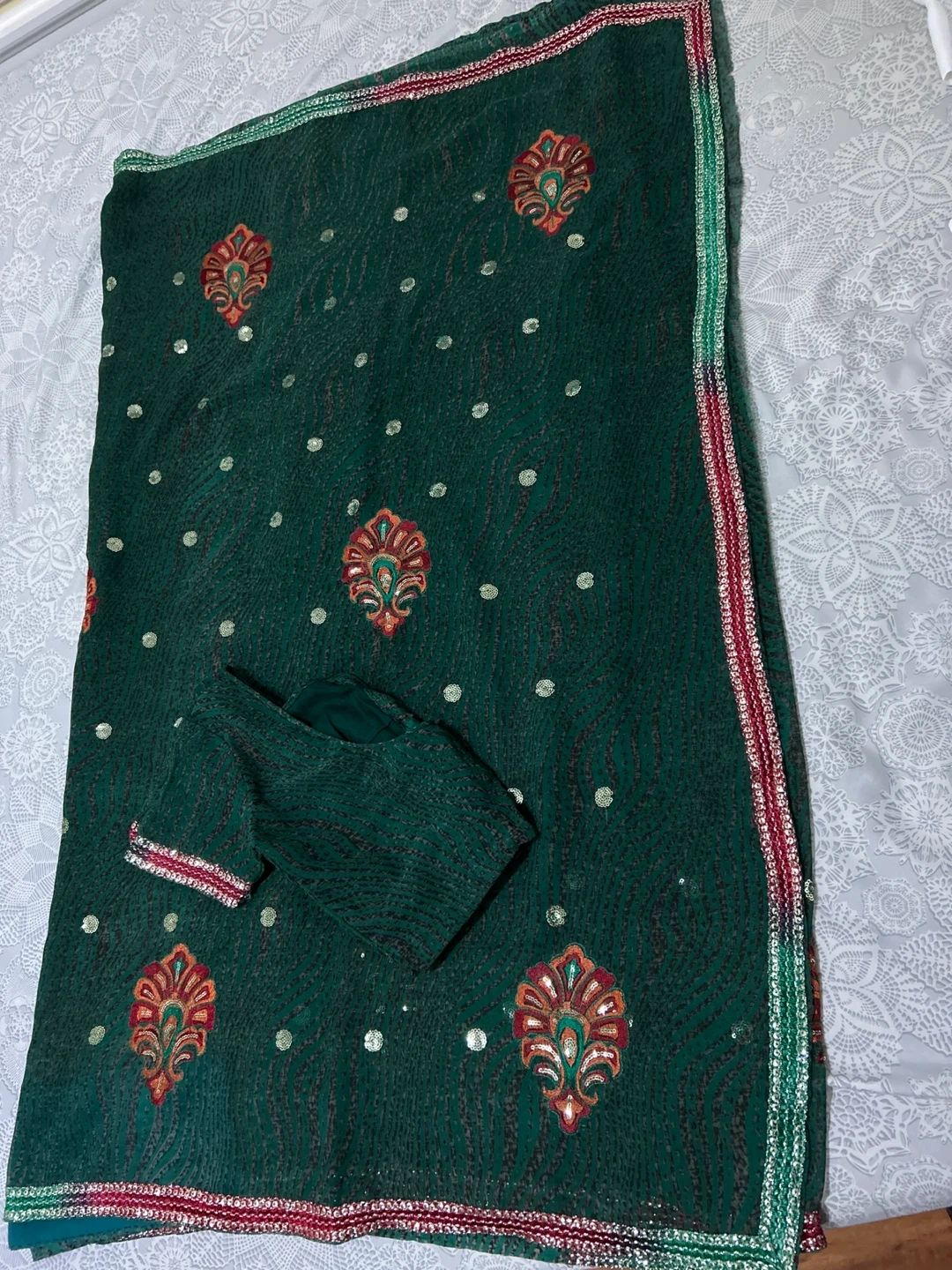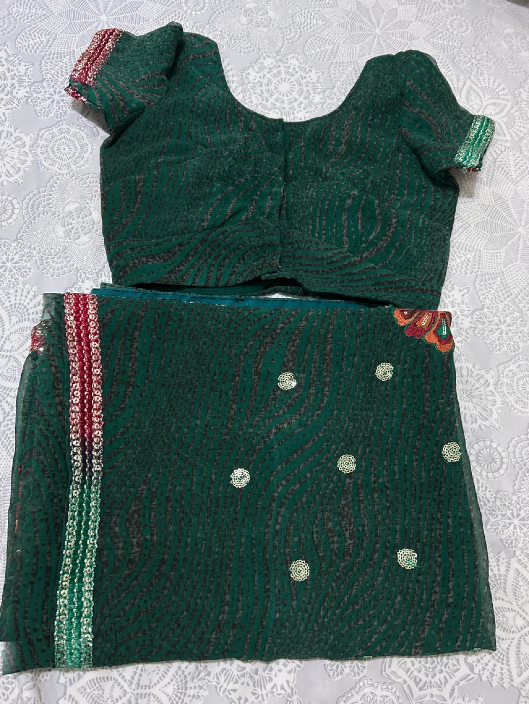 Beautiful green saree with intricate embroidery and a matching blouse piece. The saree features delicate patterns and a decorative border. Perfect for a special occasion or cultural event!