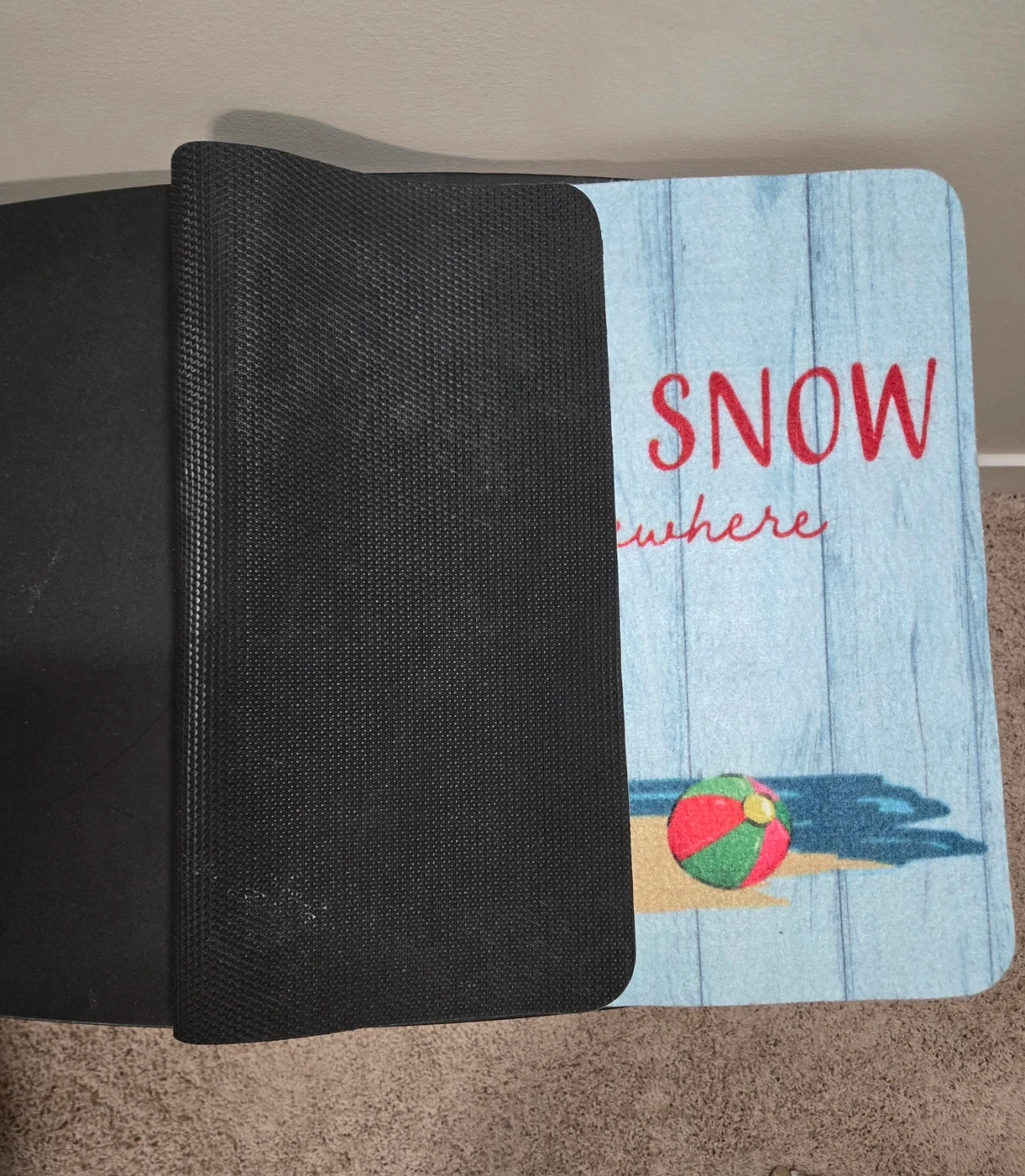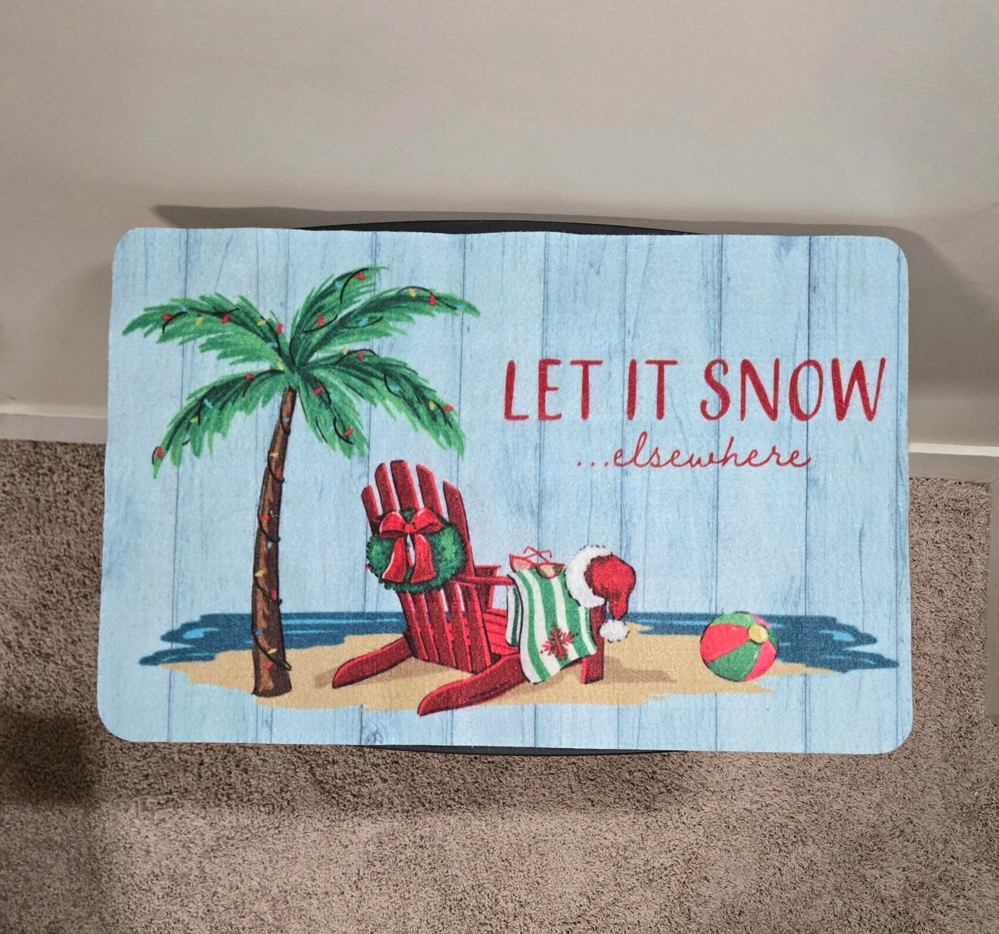 Great condition. 26.5"×17". Doormat with a beachy winter theme. It features a beach scene with the words 'Let it Snow...elsewhere'. Perfect for adding a touch of whimsy to your entryway. Cross-posted.
