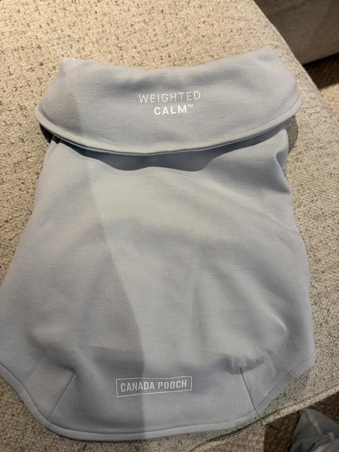 Keep your furry friend feeling secure and calm with this Canada Pooch Weighted Calm coat! The soft, light-blue colour is super stylish and the coat is in great condition. Perfect for those pups who need a little extra comfort