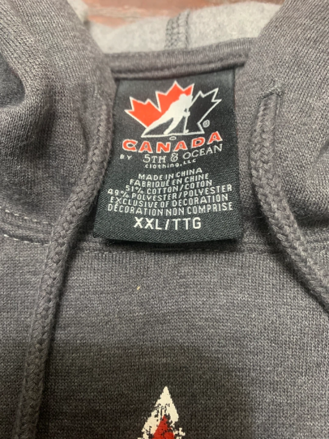Selling a Canada Hockey hoodie by 5th & Ocean Clothing. It's a size XXL and made of 51% cotton and 49% polyester. The hoodie is grey with a red and white Canada Hockey design on the front