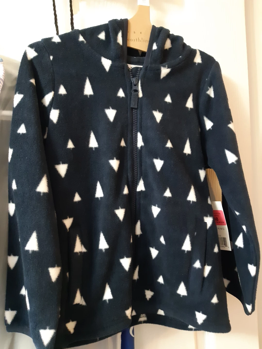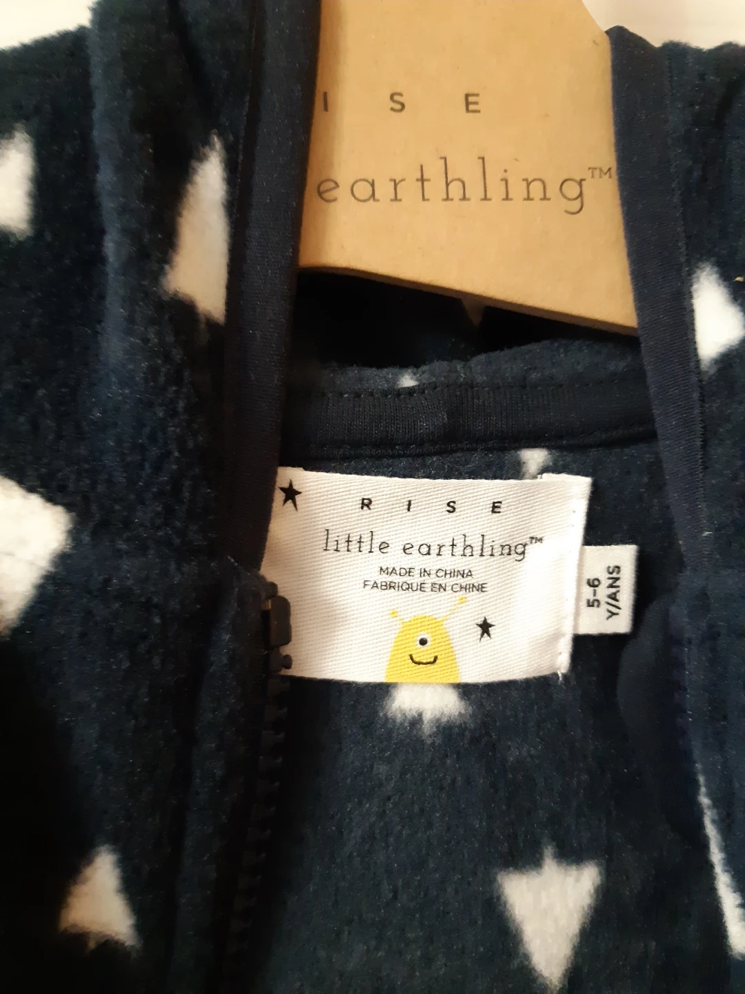 Cozy Little Earthling fleece hoodie in a cute navy blue colour with a white tree pattern! The size is 5-6 years. Perfect for keeping your little one warm and stylish during cooler weather