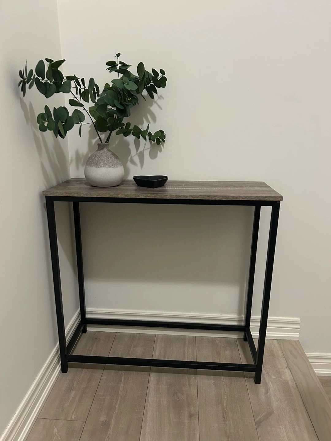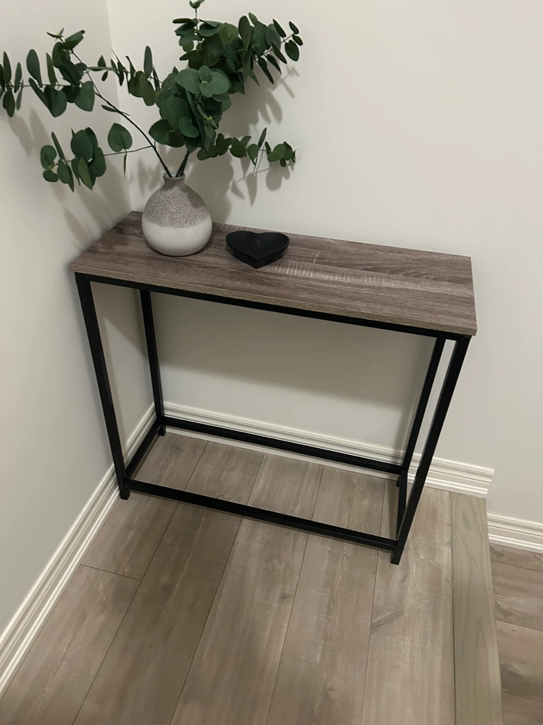 A simple console table with a wood-look top and a black metal frame. Perfect for an entryway or hallway! It's in great condition and ready for a new home.