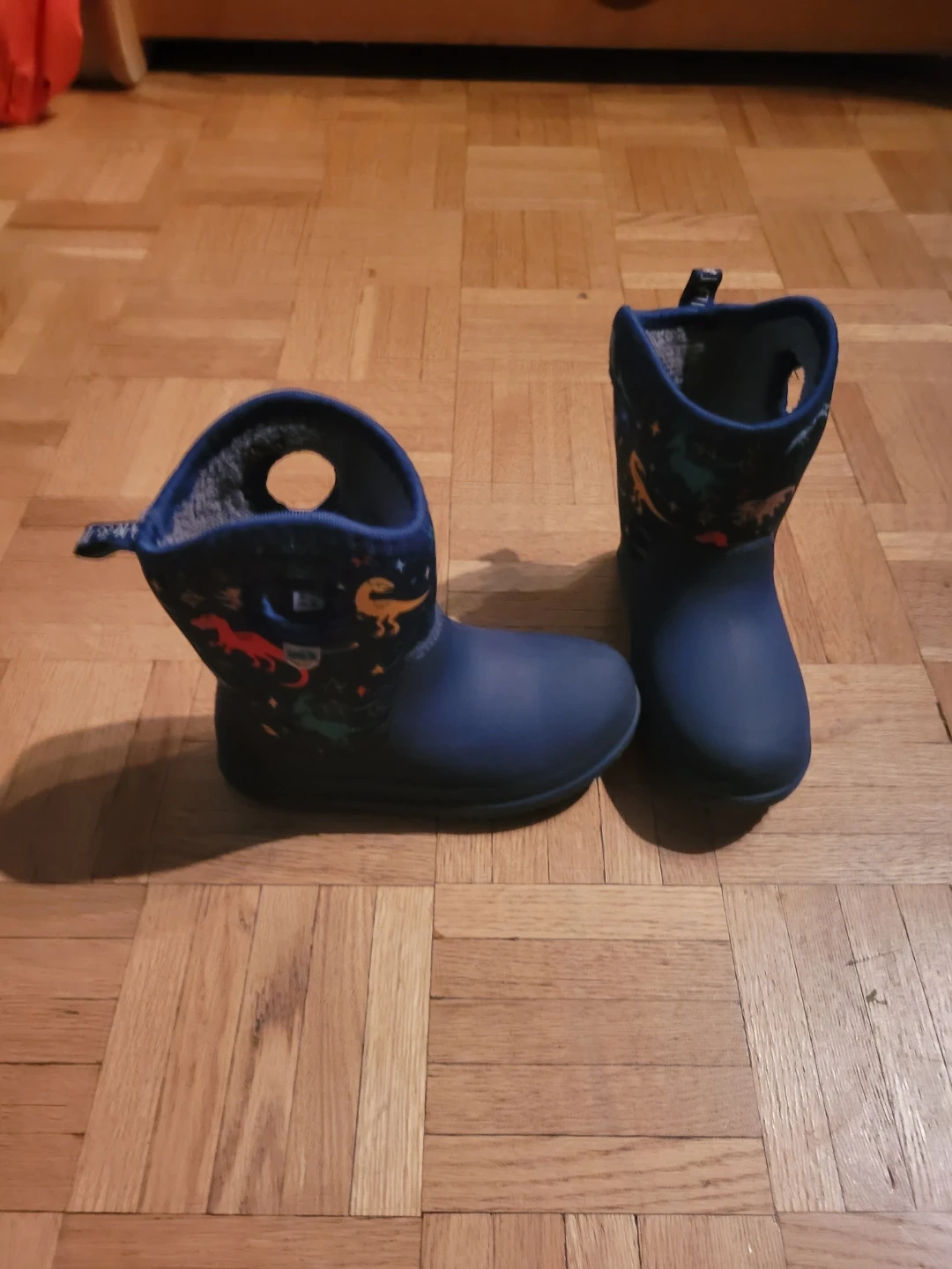 Selling a pair of waterproof winter boots in toddler size 10. They are in great condition and feature a fun dinosaur pattern and a warm sherpa lining.