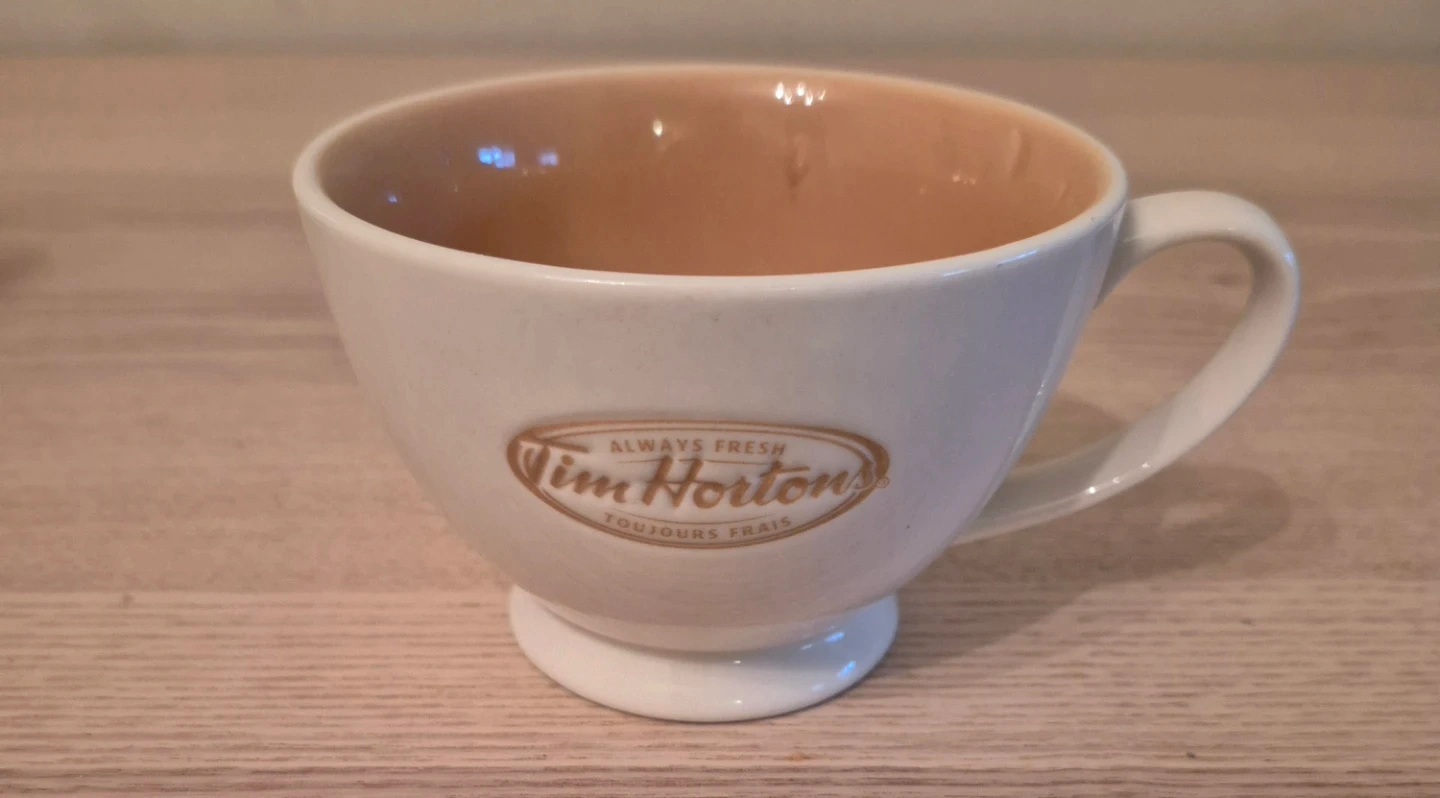 Selling a few mugs! There's a tall mug with a snowman and a Christmas tree design, a white mug with red reindeer and a Christmas tree, and a Tim Hortons tea cup.