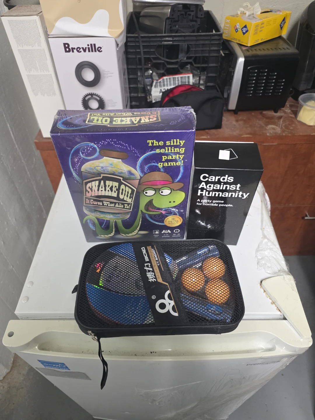 Selling a copy of Snake Oil, the silly selling party game, along with Cards Against Humanity. Both games are in great condition and ready for some fun game nights! And also a ping pong set.