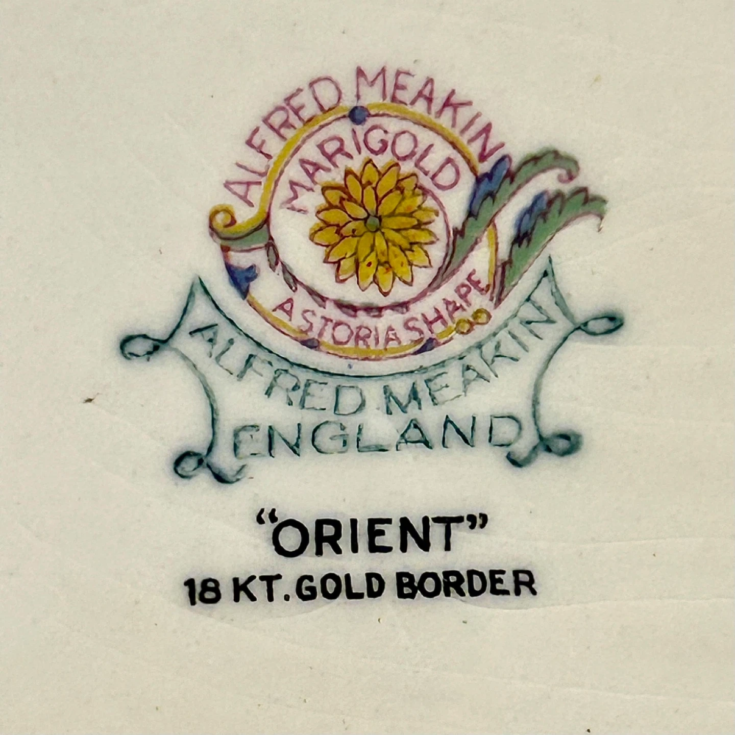 Alfred Meakin Ltd. was one of the most respected Staffordshire potteries, supplying both the British and North American markets. The “Orient” pattern belongs to a short-lived design movement influenced by early 20th-century fascination with Asian aesthetics, predating later mass-market interpretations.