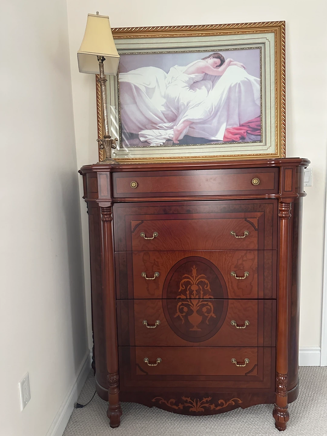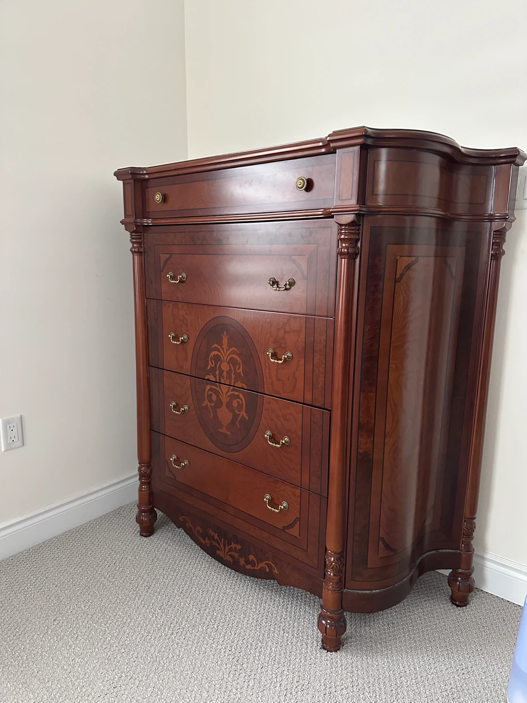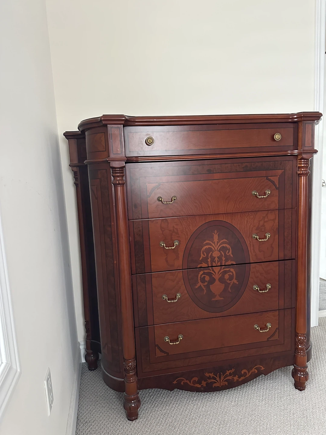 A beautiful wooden chest of drawers with a classic design. It features multiple drawers for ample storage and ornate details. Perfect for adding a touch of elegance to any room