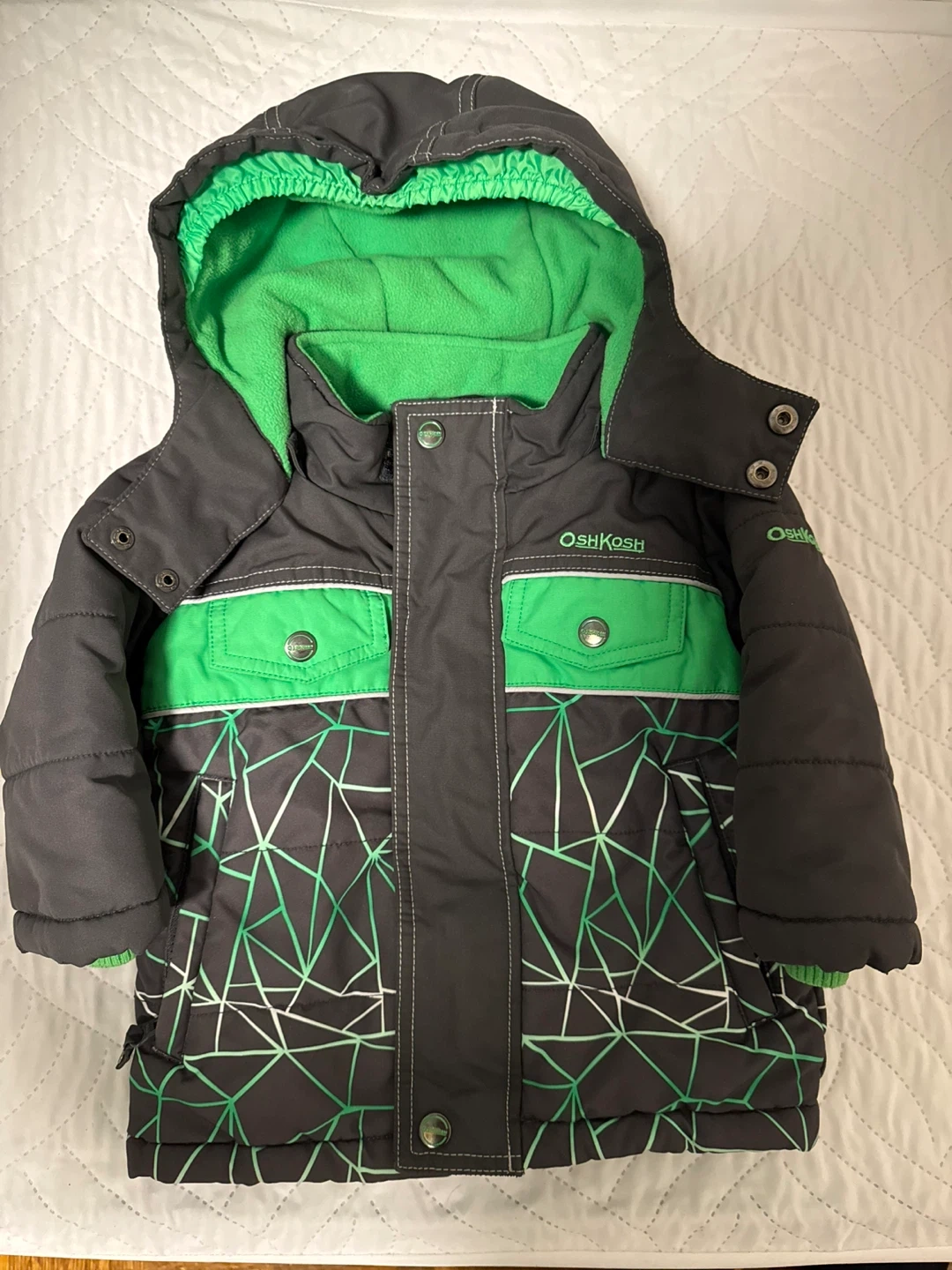 Cozy OshKosh winter jacket, perfect for keeping your little one warm during the colder months! It features a hood and a stylish design with green accents.