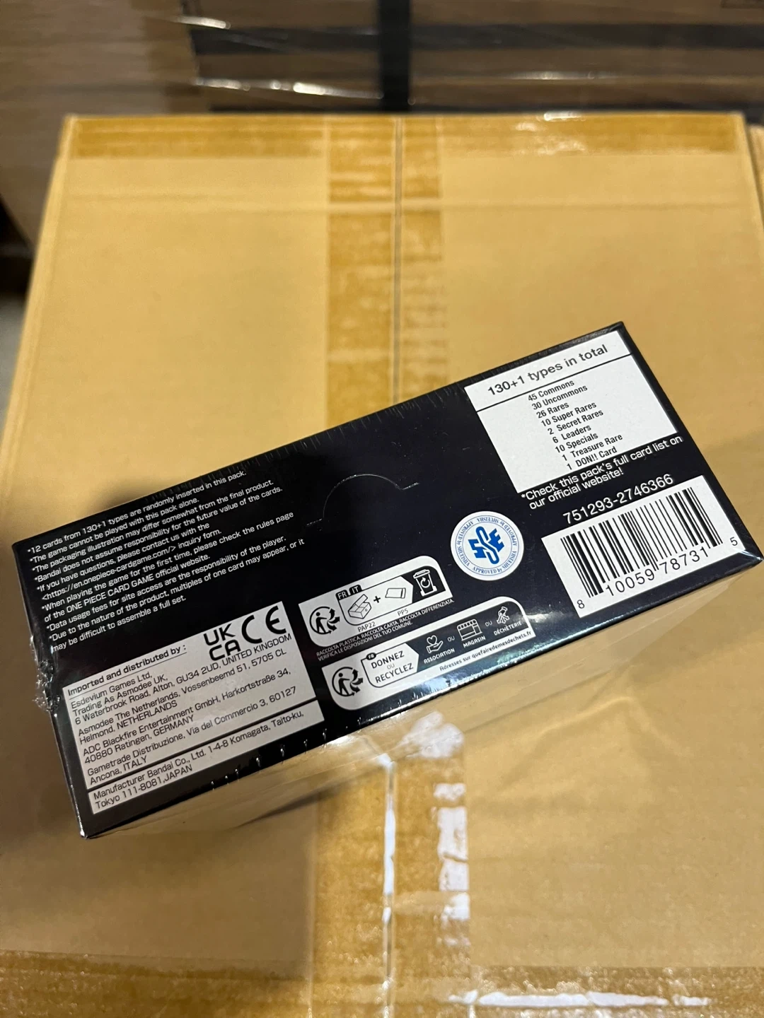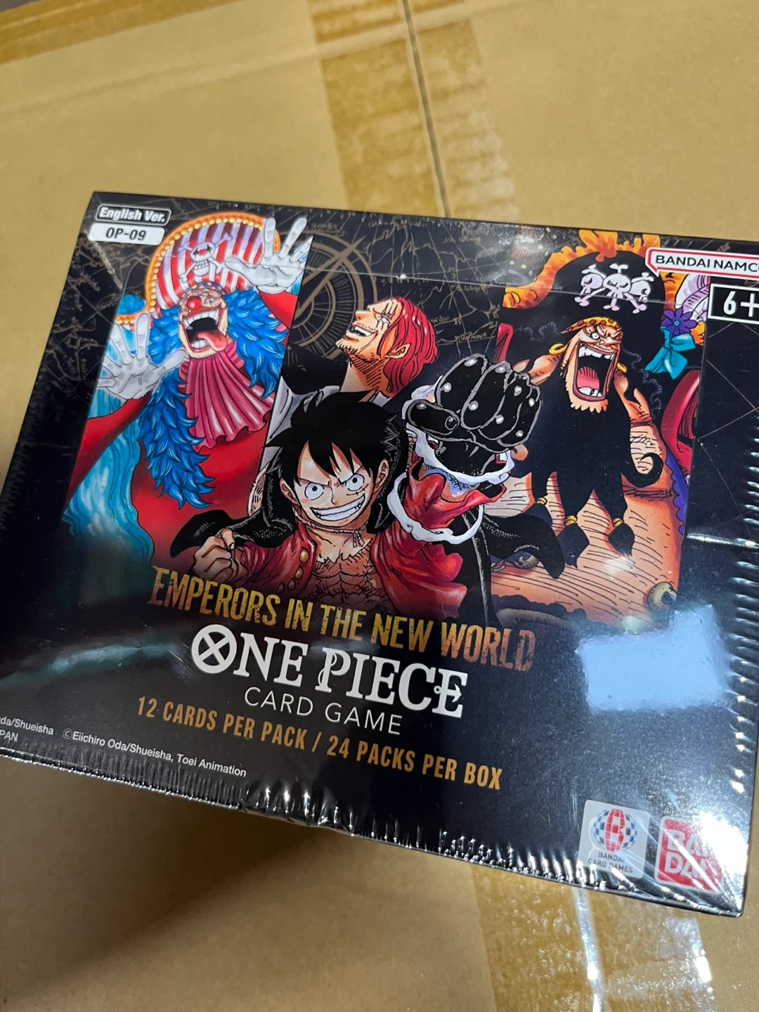Selling a sealed box of the One Piece Card Game, Emperors in the New World (OP-09)! This is the English version. The box contains 12 cards per pack and 24 packs per box. There are 130+1 types of cards in total, including Commons, Uncommons, Rares, Super Rares, Secret Rares, Leaders, Treasures, and DON!! Cards