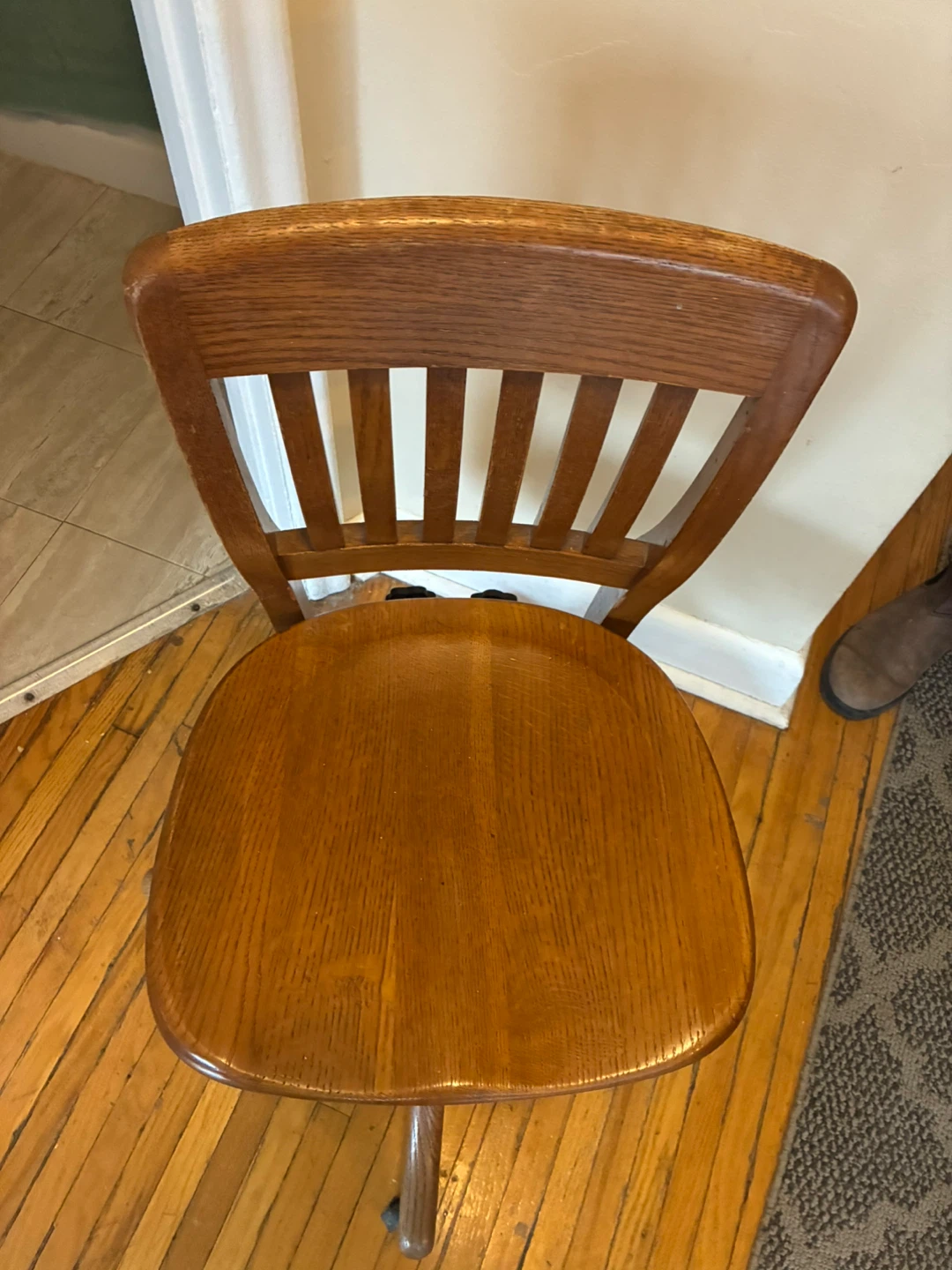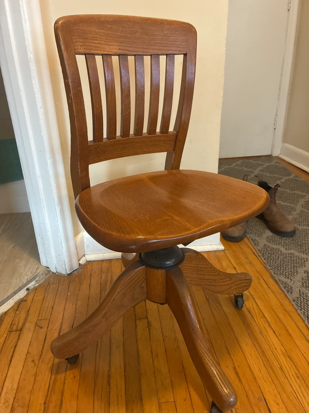 Solid oak swivel office chair made by Gilson Furniture in Guelph, Ontario, circa 1940s. These were built for offices and institutions and are known for their durability and simple, functional design.