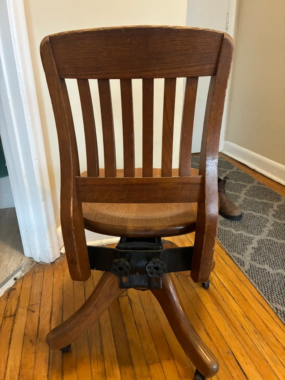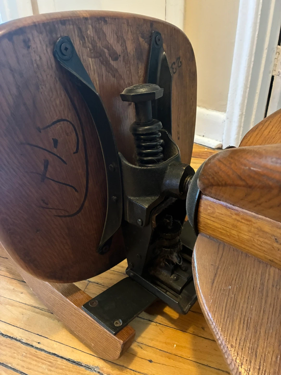 Features original cast-iron and steel adjustment hardware, a spring-loaded back, swivel base, and beautiful oak grain throughout. Fully functional and very sturdy.