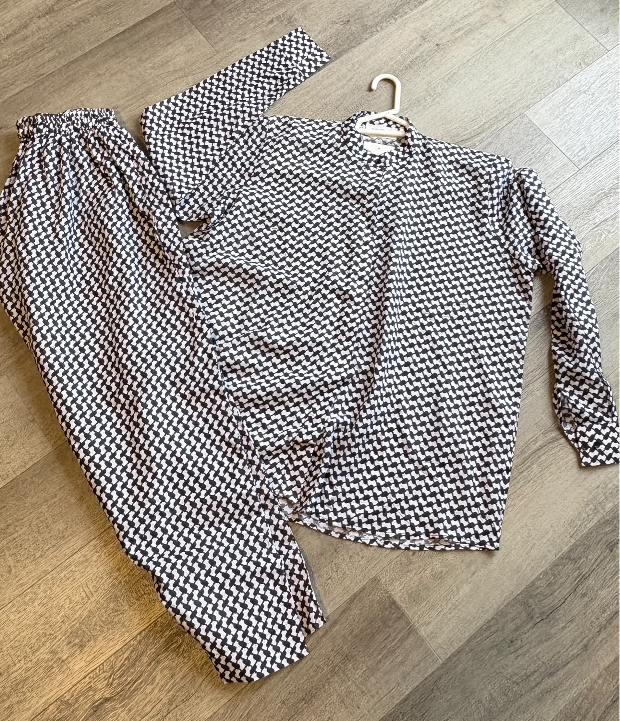 Here's a stylish black patterned matching set! It's perfect for lounging at home or a casual day out. The set includes a long-sleeved top and comfortable pants with an elastic waistband. The material is soft and breathable, making it ideal for year-round wear