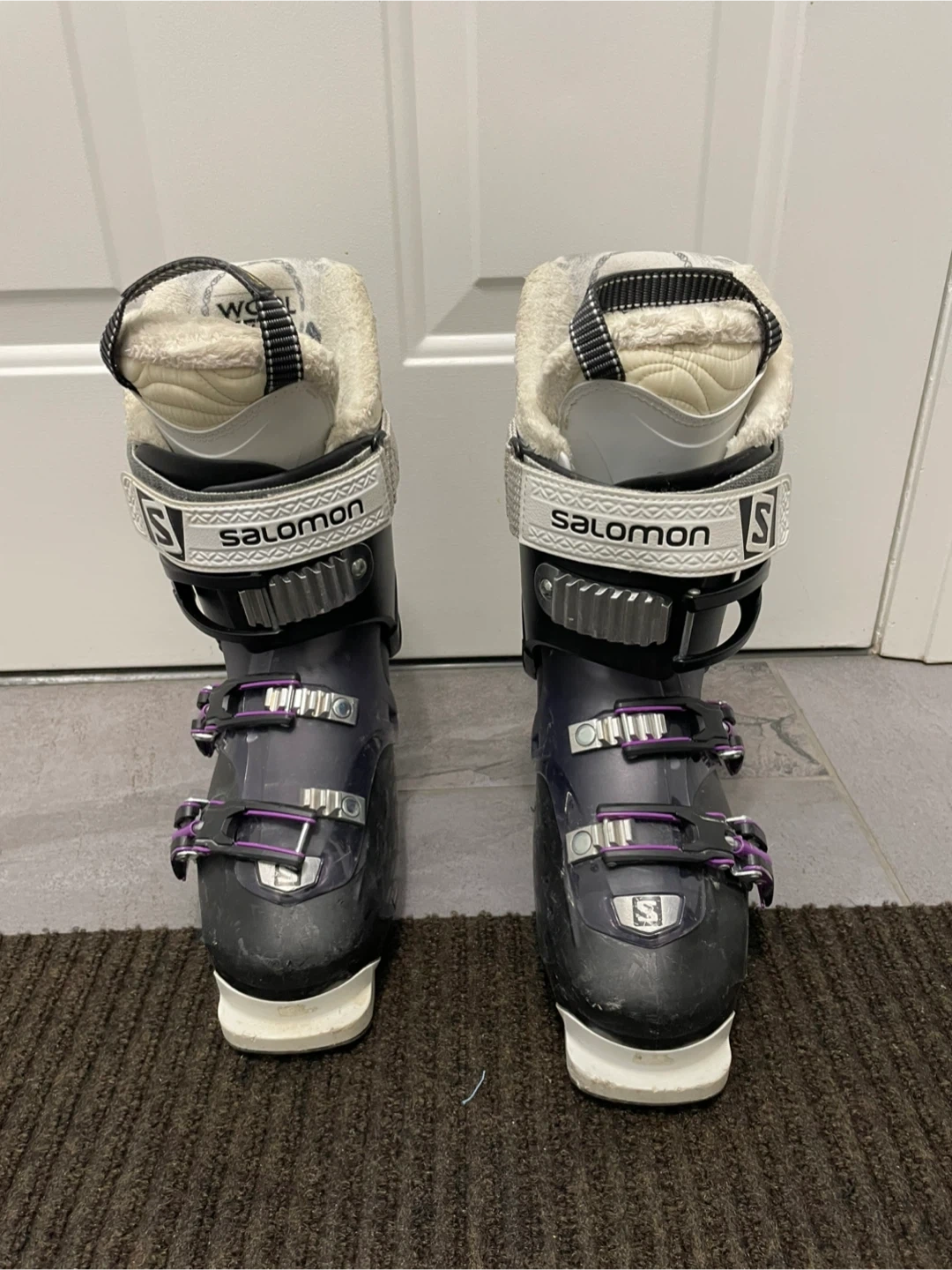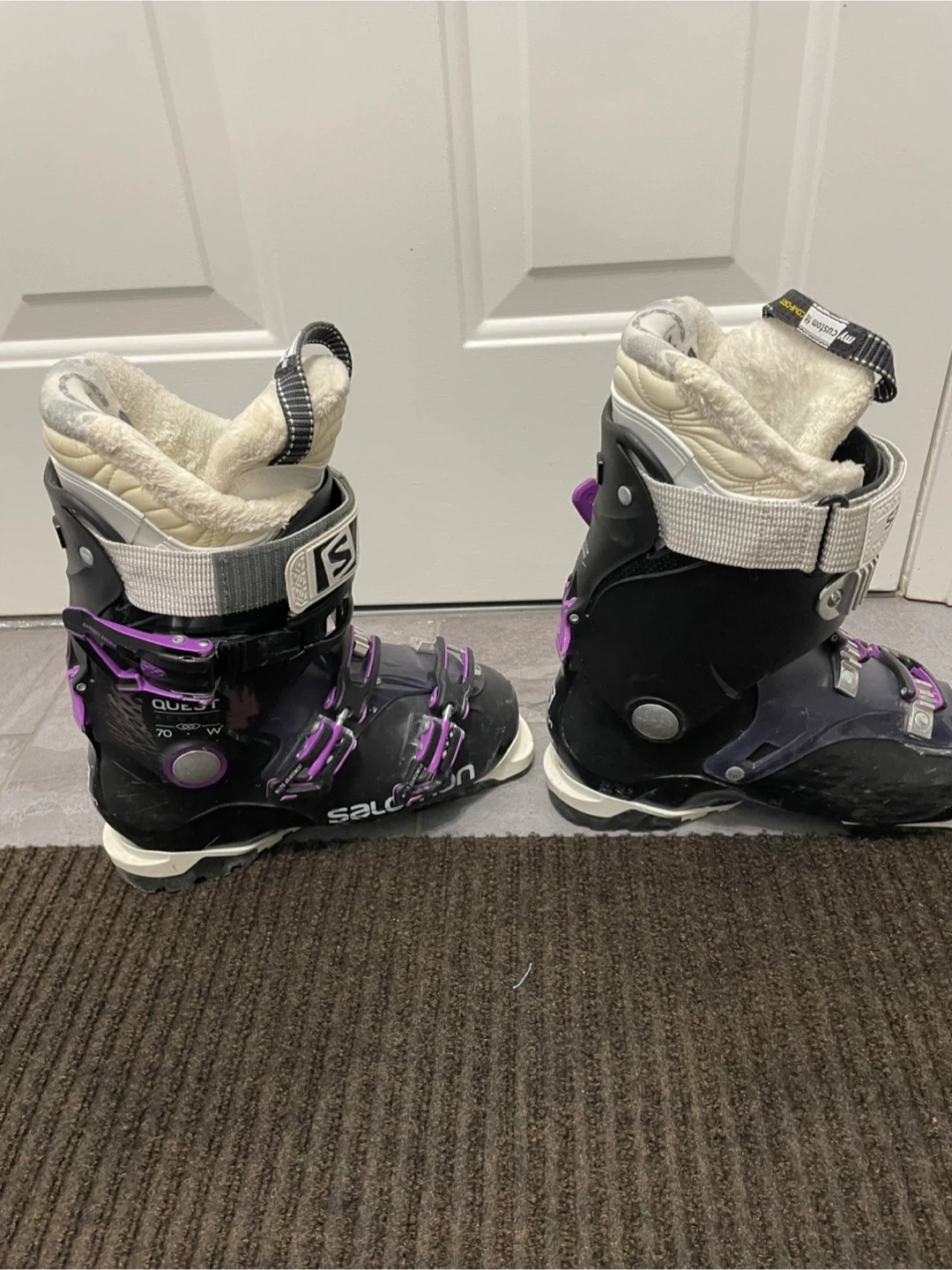Selling a pair of Salomon Quest 70 W ski boots in size 24/24.5. These boots have a magnesium backbone and hike ride feature. They are black and purple in colour and in good condition for hitting the slopes!