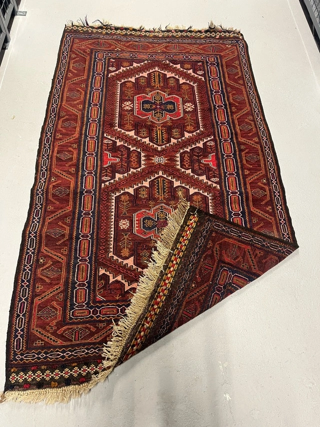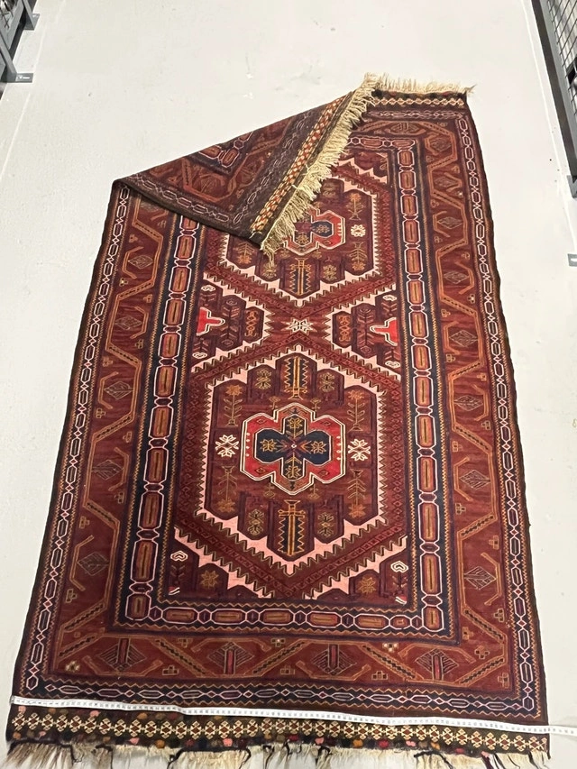 This beautiful Afghan tribal rug features rich, earthy tones and intricate geometric patterns, hand-knotted for durability and a unique, vintage charm; it measures 100 cm by 177 cm. It's in used condition. Add a touch of global elegance to your home with this eye-catching rug! This rug has character, like that eccentric aunt who collects porcelain dolls and always has a story to tell. Don't miss the chance to own a piece that's not just a decor item, but a conversation starter! And remember, if the ad is still up, it's still available.
