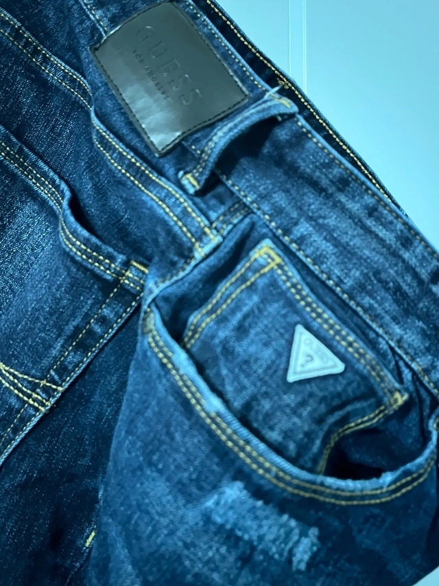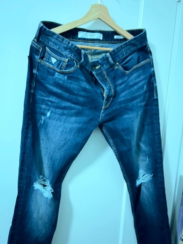 Rock these Guess jeans with a stylishly distressed look, perfect for adding some edge to your wardrobe. These jeans feature a classic dark wash, distressed detailing at the knees, and signature Guess branding. They are in fair condition, showing some wear that adds to their character.