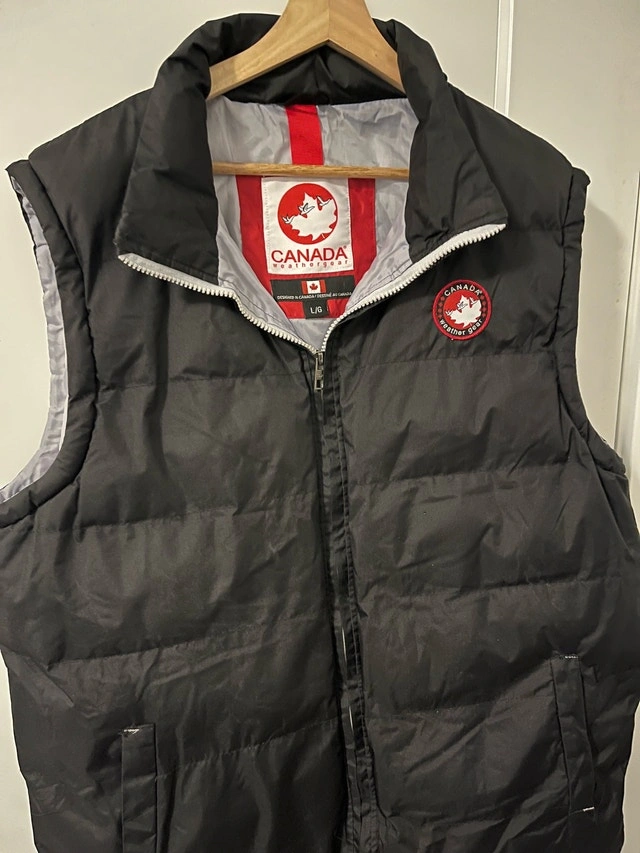 This Canada Weather Gear vest is a stylish and functional addition to any wardrobe, perfect for layering during cooler weather. The vest is in good condition, showing only minor signs of wear, and features a full zip front, a comfortable padded design, and the iconic Canada Weather Gear logo on the chest. Additional Features: