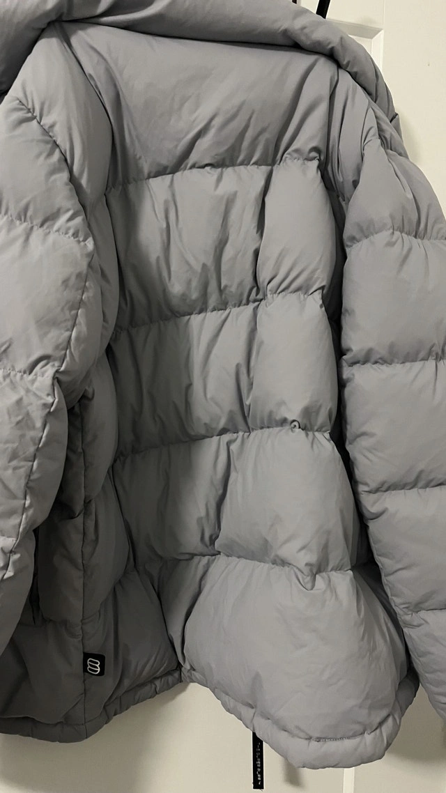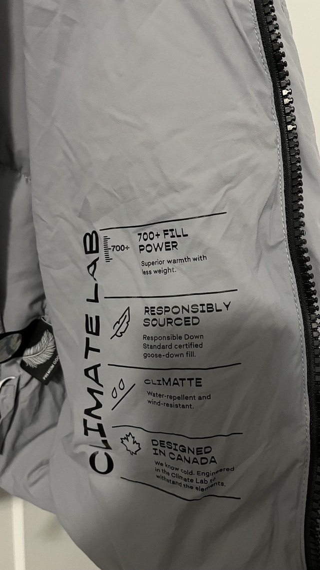 Stay super original and warm with this Climate Lab grey puffer jacket, designed in Canada. This jacket is in excellent condition, nearly new. It features 700+ fill power for superior warmth without the weight, and is responsibly sourced with responsible down standard certified goose-down fill. The jacket is also water-repellent and wind-resistant. If the ad is up, it's available! It's ready for a new home.