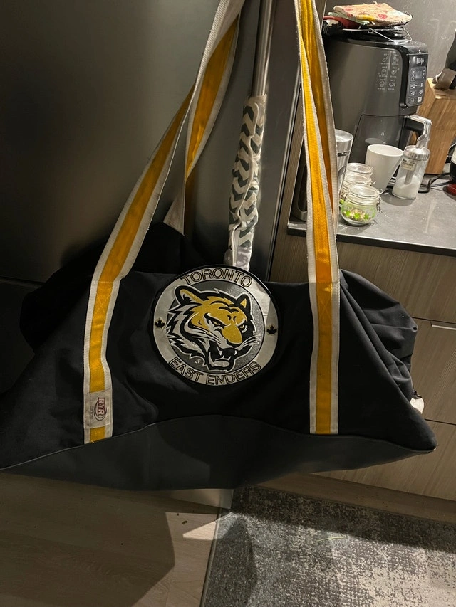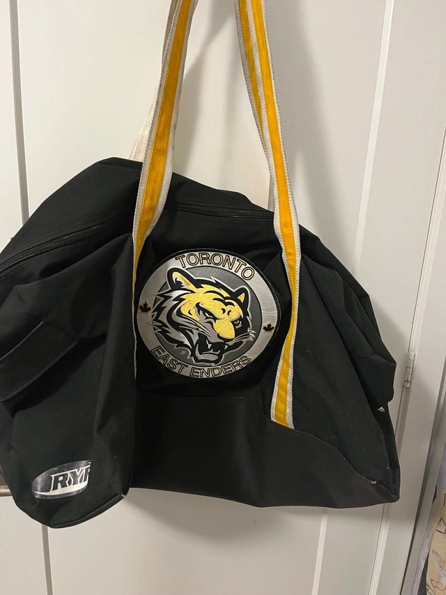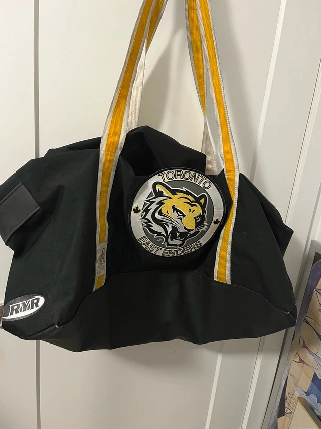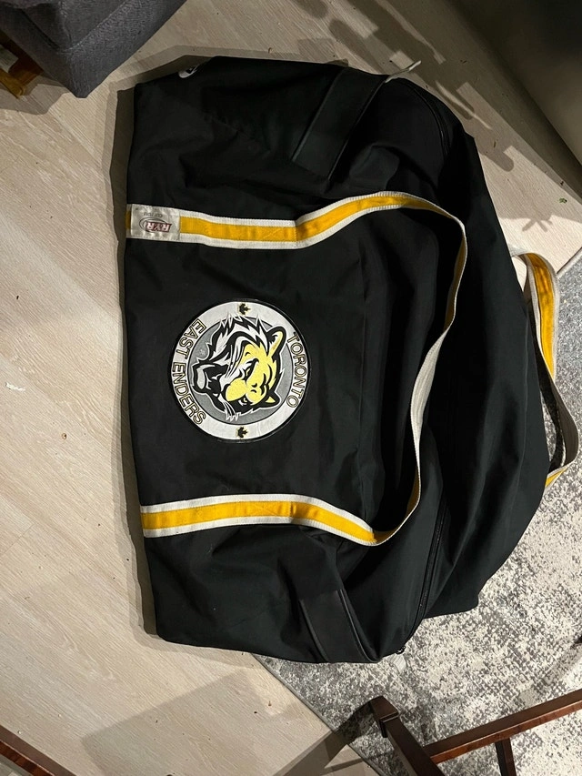 This is a used Toronto East Enders bag that is perfect for carrying your gear to the rink or gym. The bag is in good condition, with some signs of wear, as can be seen in the photos. It's a sturdy and reliable bag, ready for plenty more use. This bag features the Toronto East Enders logo prominently displayed. It's ideal for any fan or player who wants to show their team pride.