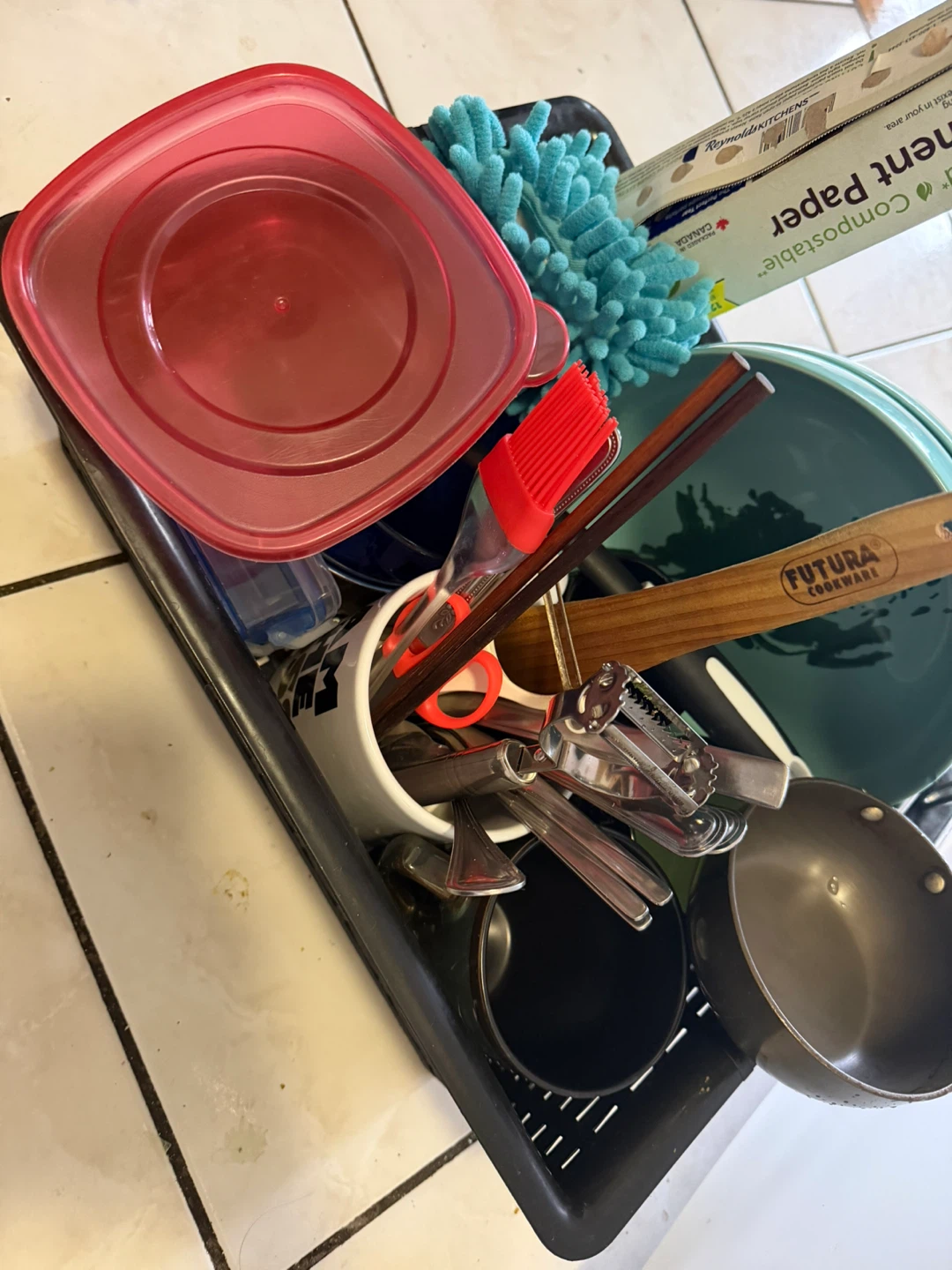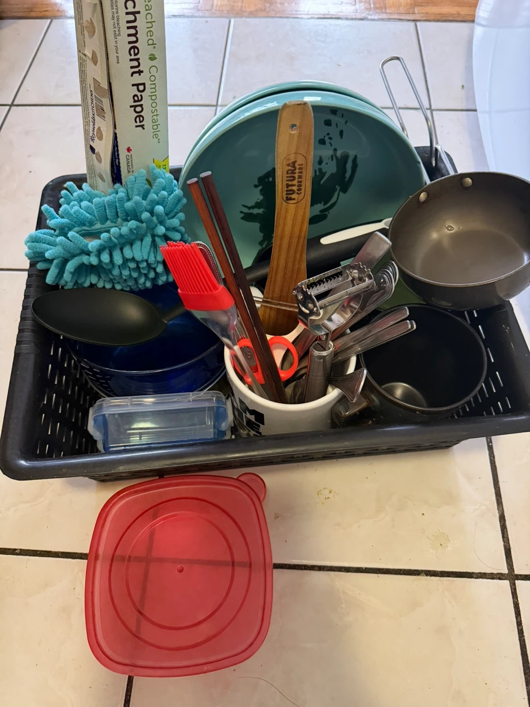 Selling a collection of mixed kitchen utensils. Includes a variety of items such as 4pic of cups, 2 plates, 2 bowls, cooking utensils, small fry pan, spatula and food storage containers. Great for stocking a new kitchen or supplementing your existing set
