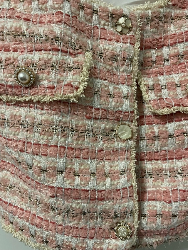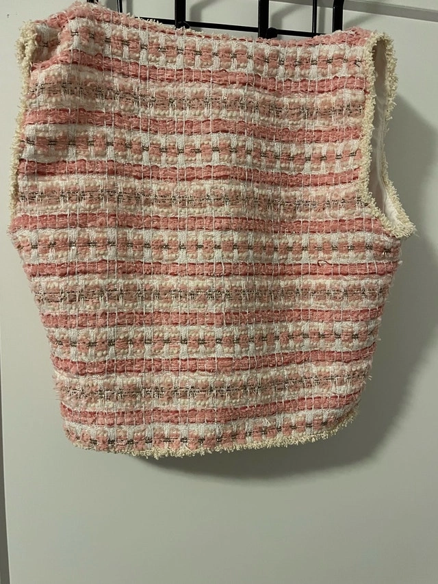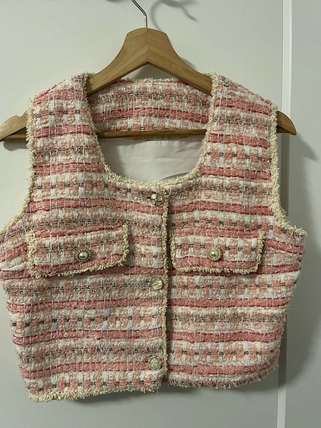 Add a touch of elegance to your wardrobe with this stylish tweed vest! Featuring a beautiful pink and white pattern with pearl button accents, this vest is perfect for layering. Note that this item is in used, but very good condition. It comes from a pet and smoke free home. I've priced mine competitively. If you're seeing this ad, it's still available!