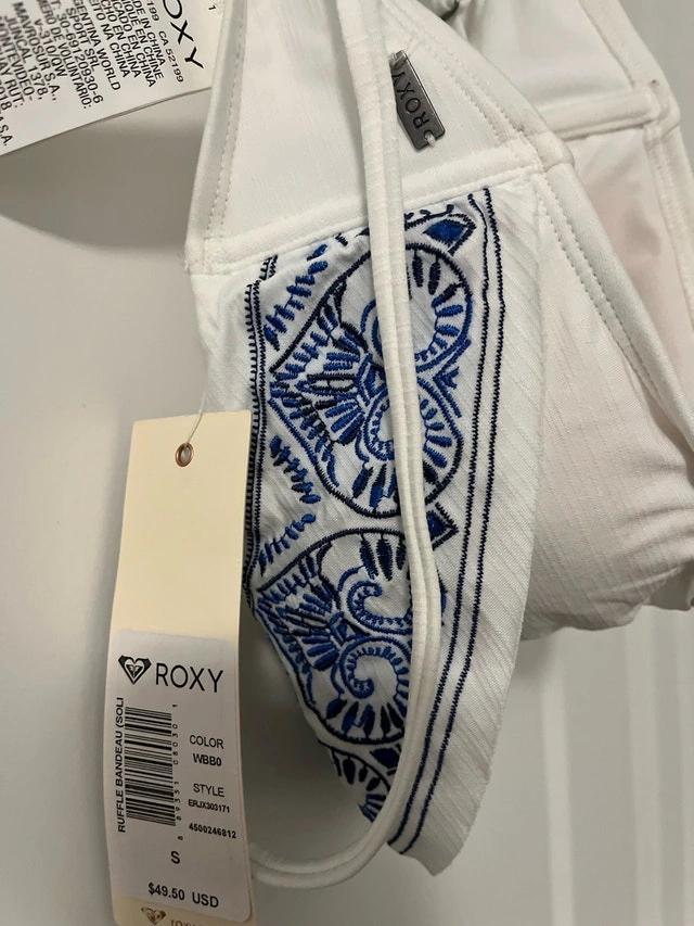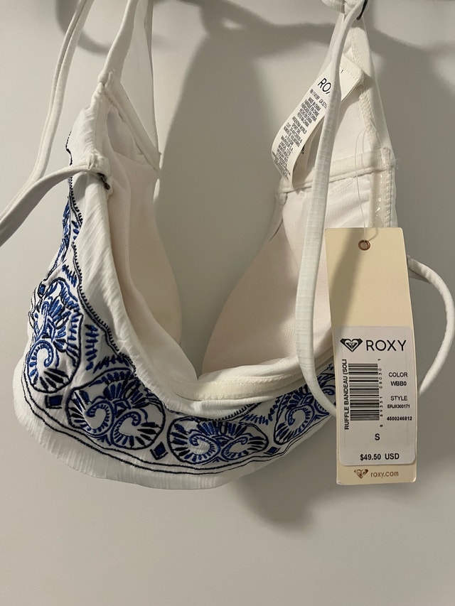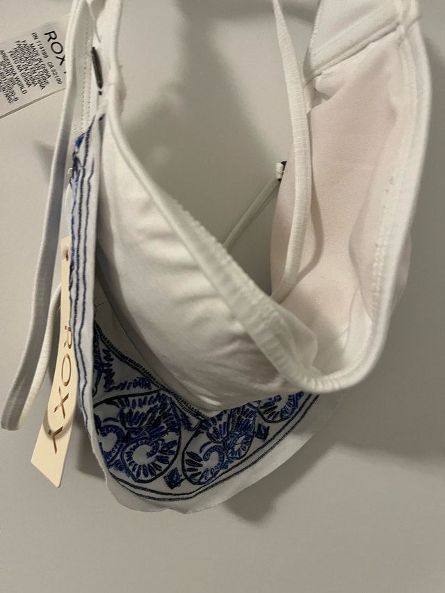 This Roxy bikini is size small and in new condition with tags. This adorable white and blue embroidered two piece swimsuit has never been worn.