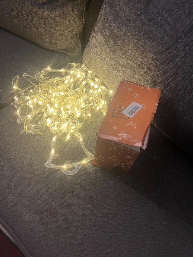 Add a touch of whimsy to your space with this LED Modeling Lamp. The lamp features a string of warm white LED lights shaped like stars, moons, and bells, perfect for creating a cozy atmosphere. This item is in used condition.