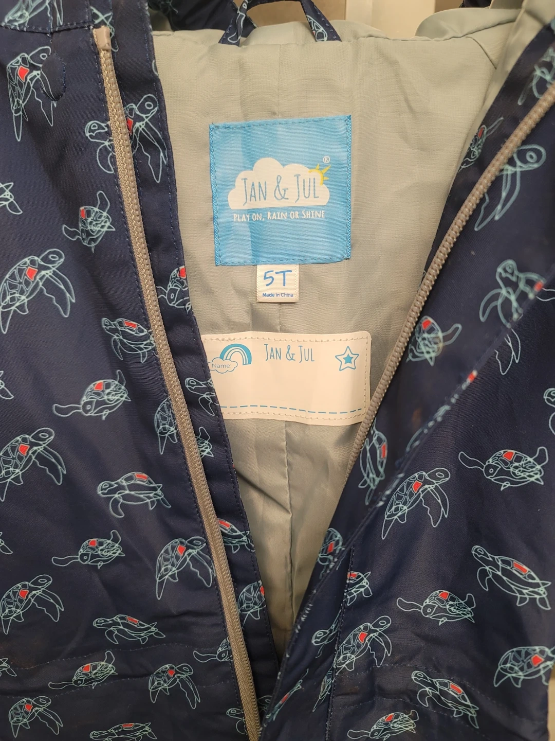 I'm selling a Jan & Jul rain suit in size 5T! It's in great condition and features a cute turtle pattern. Perfect for keeping your little one dry and happy on rainy days.