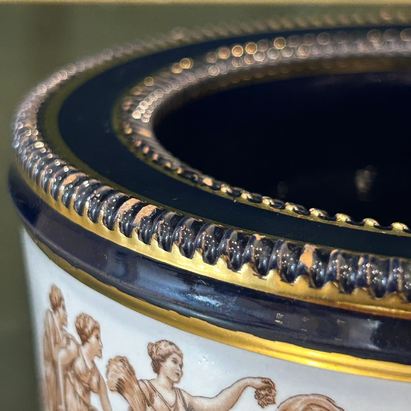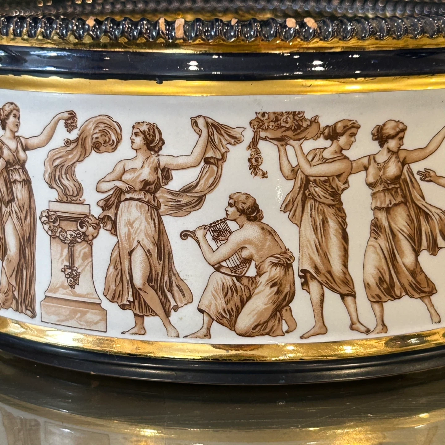 This piece features a continuous grisaille classical frieze depicting draped female figures in procession—musicians, dancers, and votive bearers—directly inspired by ancient Roman reliefs and Renaissance interpretations of antiquity. The imagery closely follows motifs popularized by Wedgwood jasperware and Grand Tour decorative arts, long favored by European aristocratic collectors.