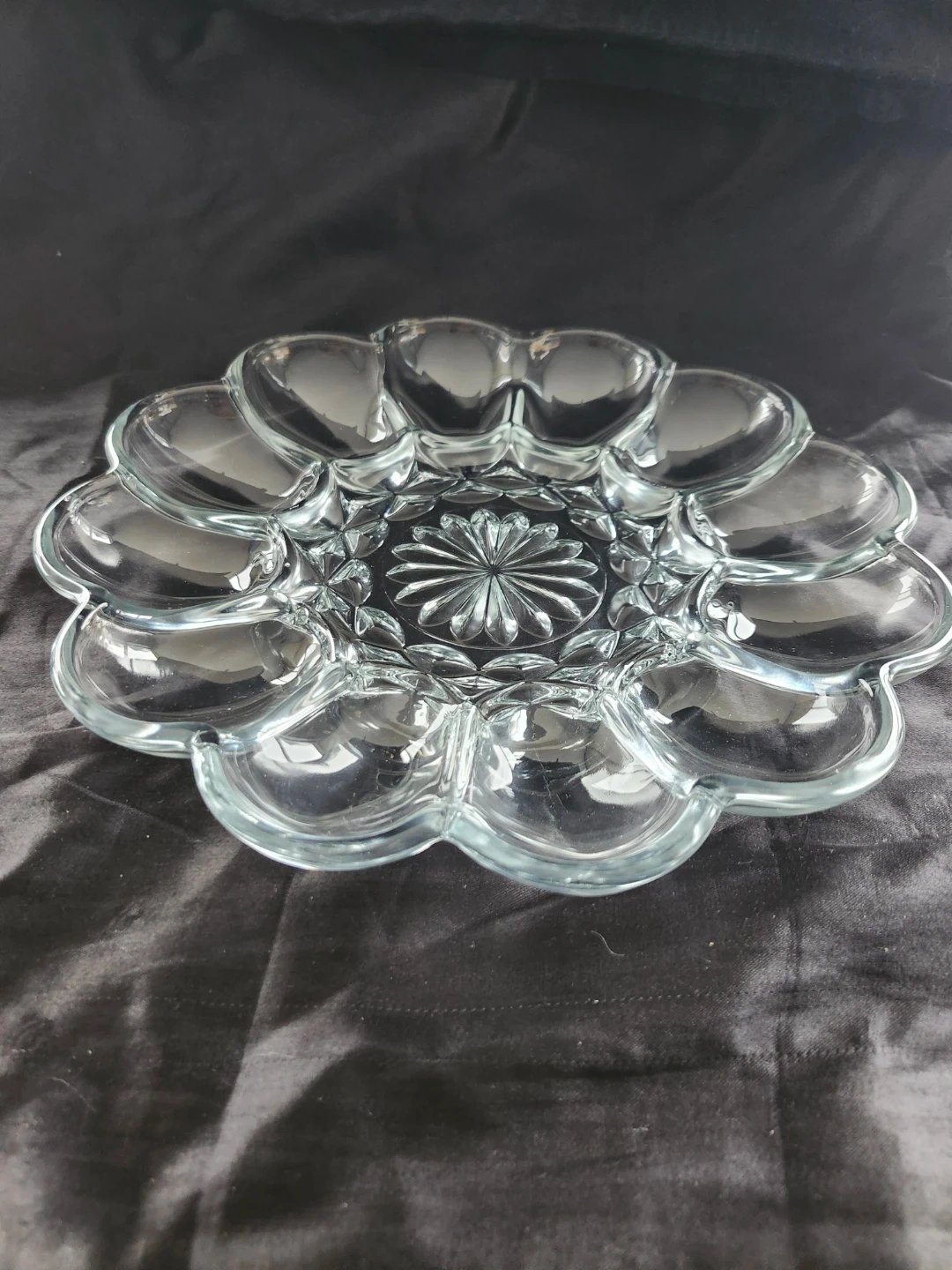 Here's a clear glass deviled egg serving tray! It's perfect for serving up your favourite deviled eggs at your next potluck or gathering. The tray has a lovely flower-like design, adding a touch of elegance to your table setting