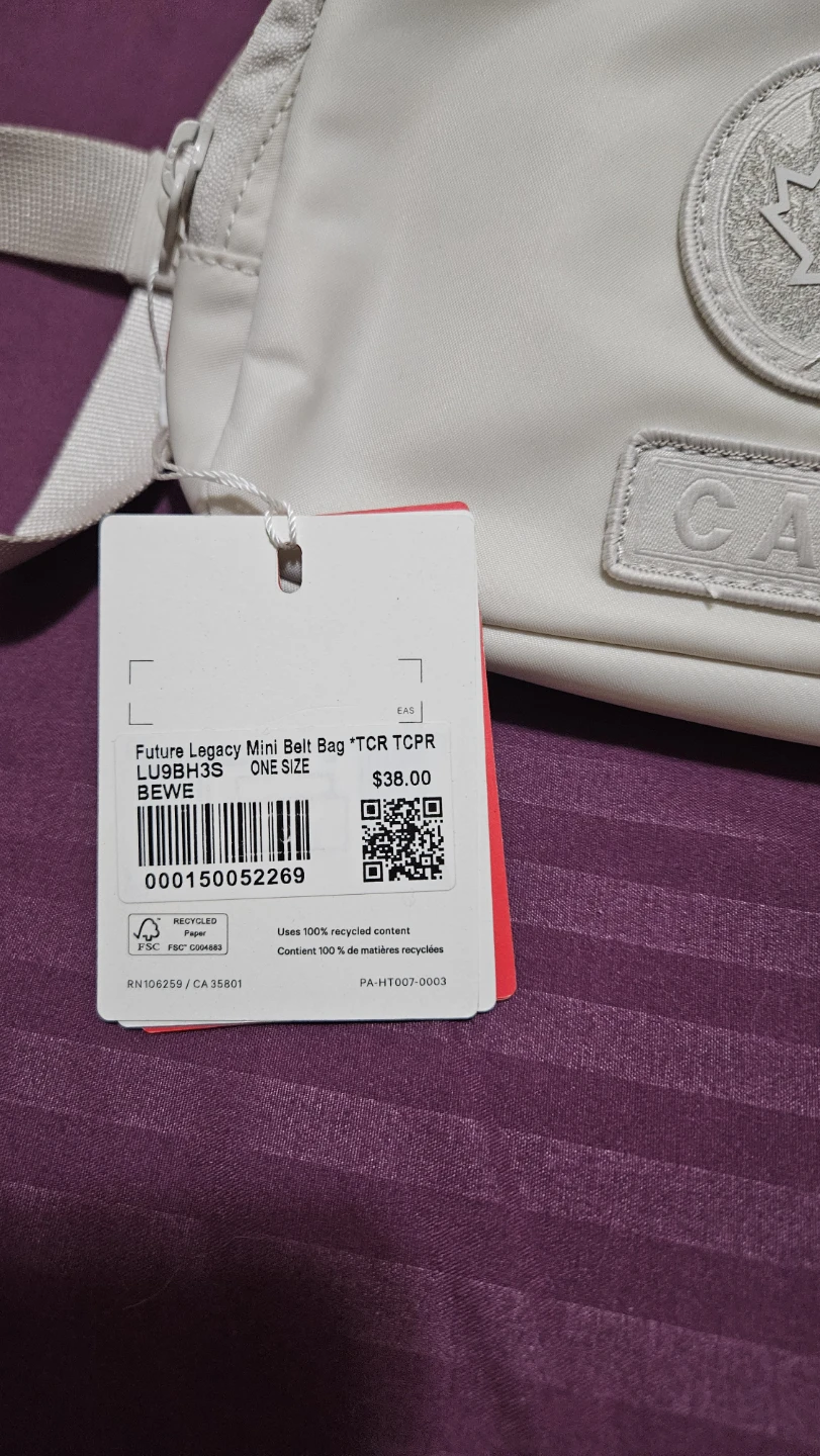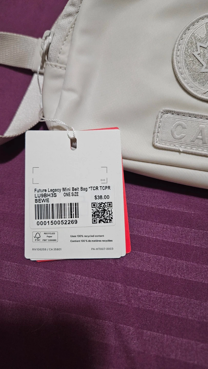 Selling a brand new with tags Lululemon Future Legacy Mini Belt Bag in the colour BEWE. It was originally $38 selling it for $25 obo. It's a cute and practical bag for carrying essentials!