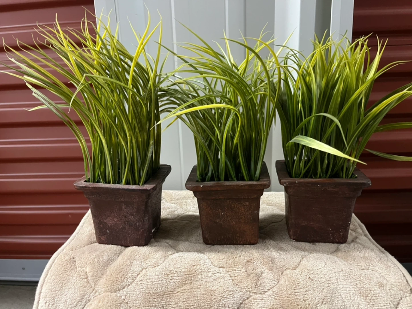 Selling a set of three artificial potted plants. These are great for adding a touch of greenery to any space without the maintenance of real plants! They come in brown square pots and feature vibrant green and yellow foliage.