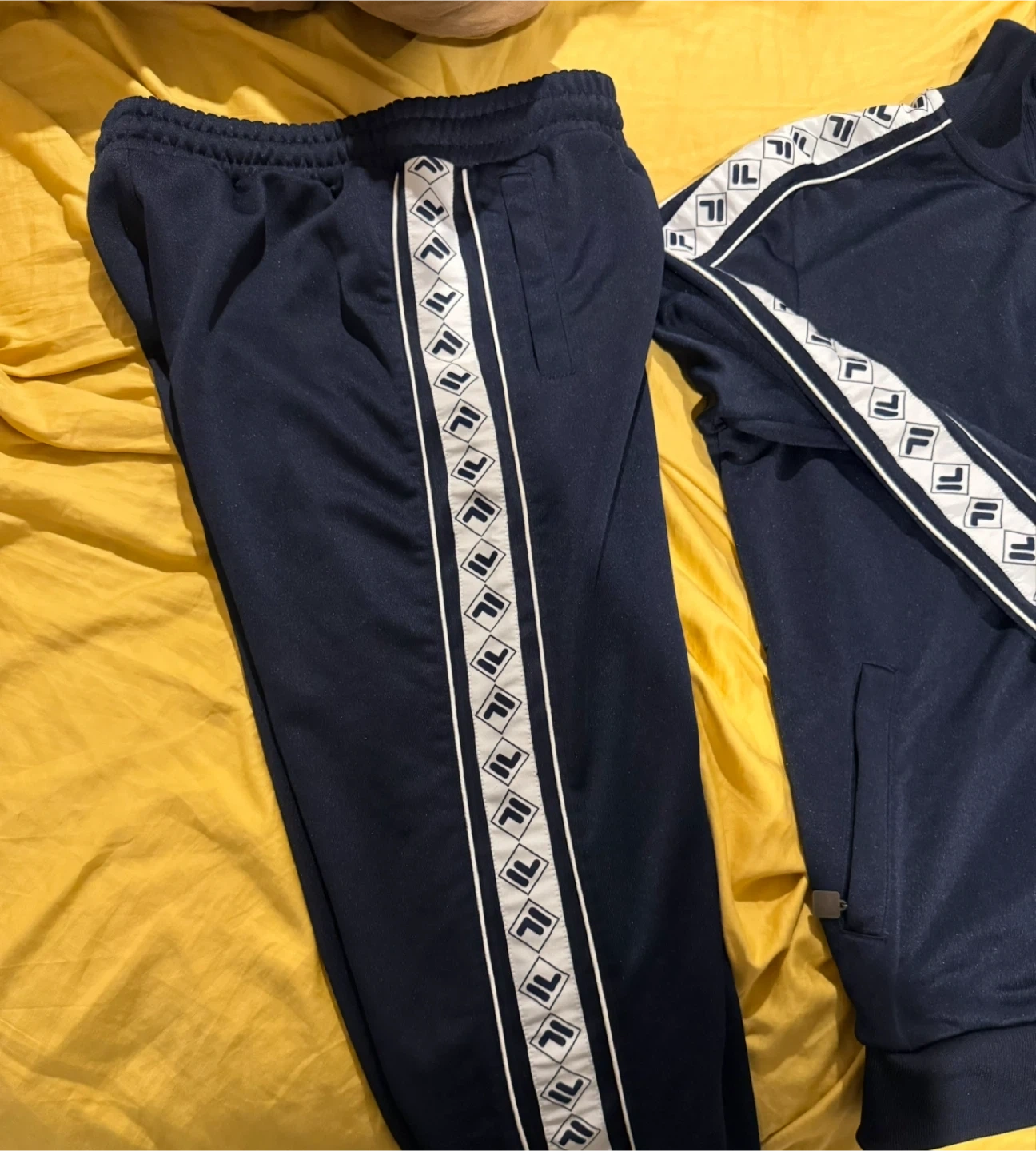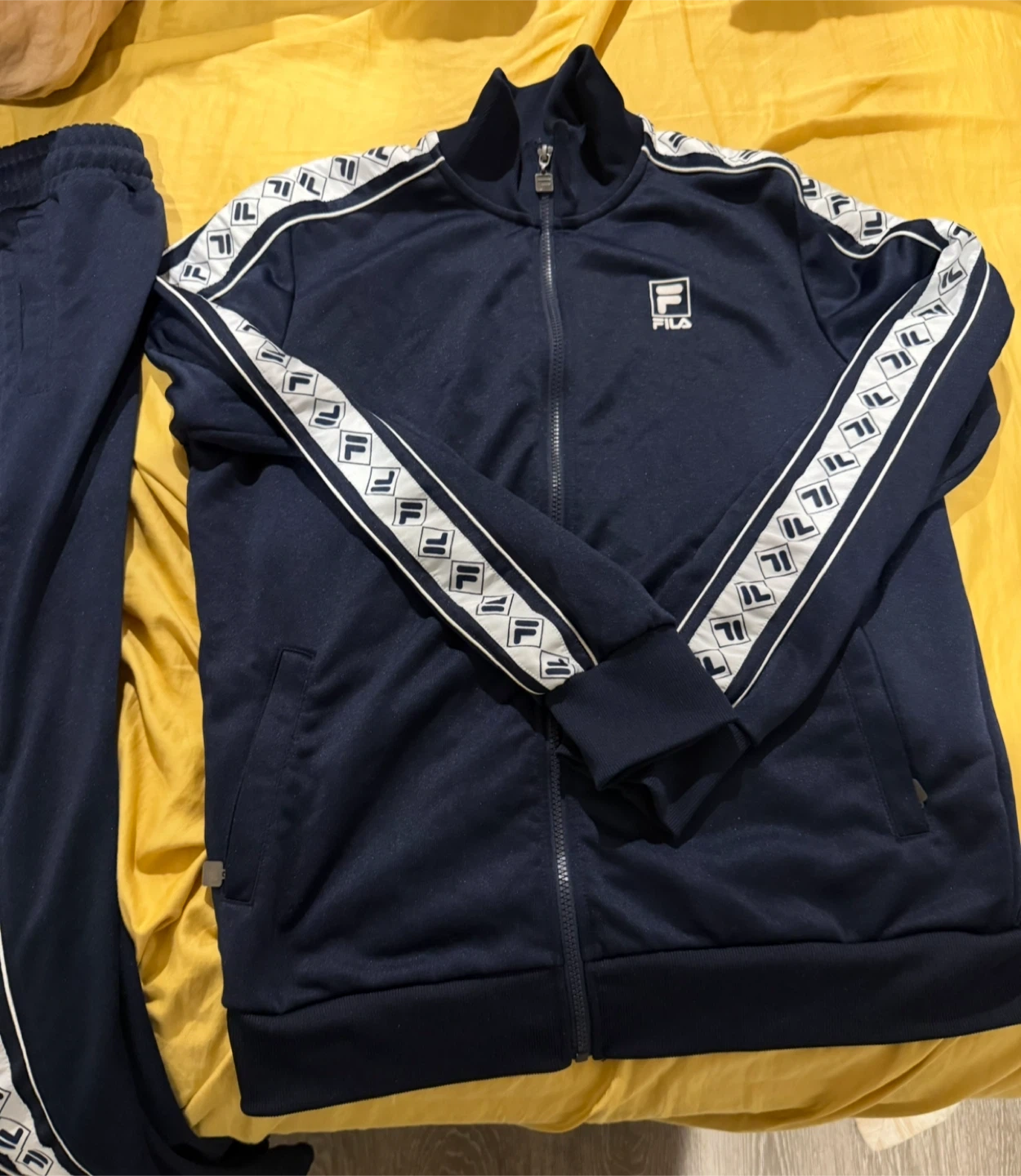FILA Men track jacket and pants set in navy blue color, pristine condition! The jacket and pants both feature the fila logo stripe design. Size: Jacket- Men M; Pants -Men S (fit 29-32).