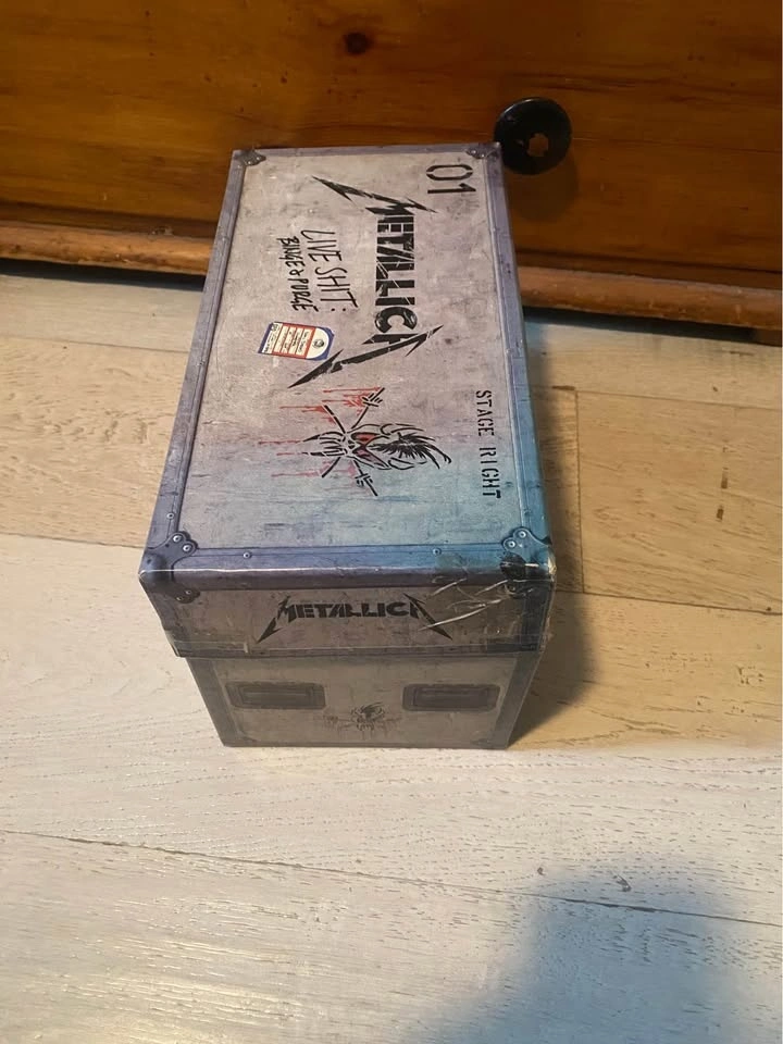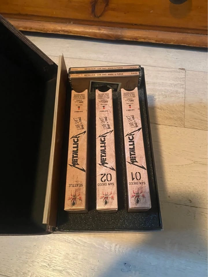 Metallica Live Sh*t Binge and Purge box set complete with book, stencil, 3 vhs tapes, and 2 tapes in original cases. Set box is made to look like a locker.