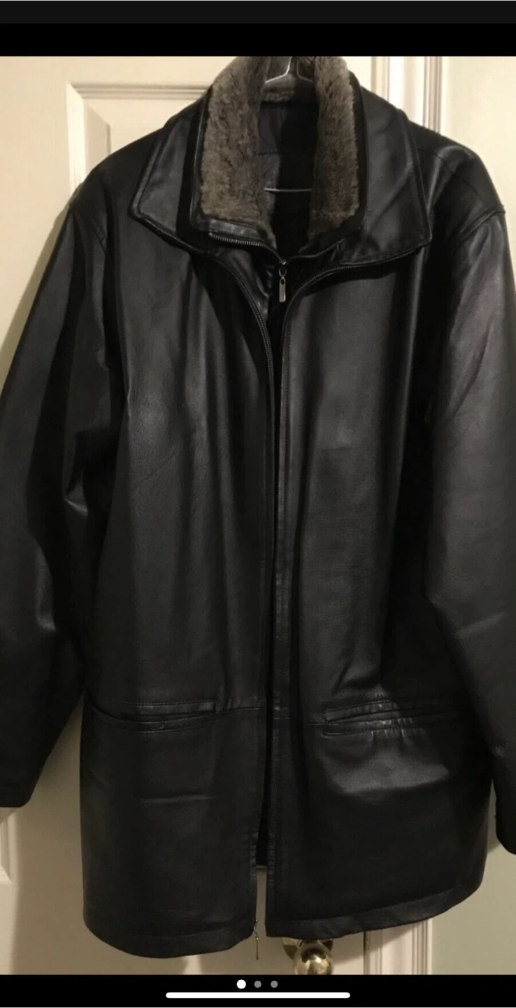 Here's a classic black leather jacket with a cozy fur collar! It's in great condition and perfect for adding a touch of style to your wardrobe. The jacket features a full double zipper and a comfortable fit. The inside has a quilted lining for extra warmth.