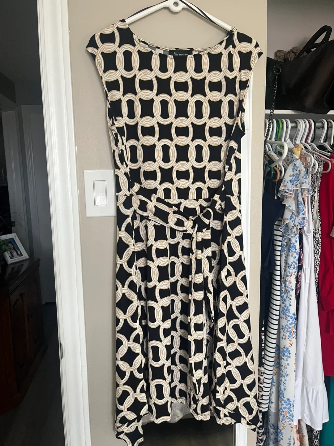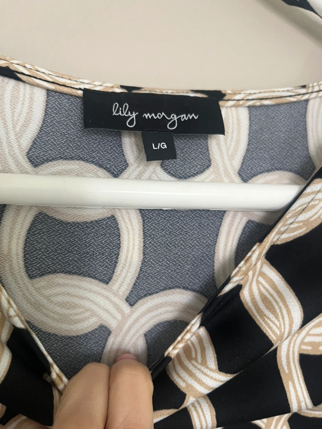 Selling a Lily Morgan dress in size large. It features a stylish black and beige pattern. The dress is in great condition and ready for a new home!