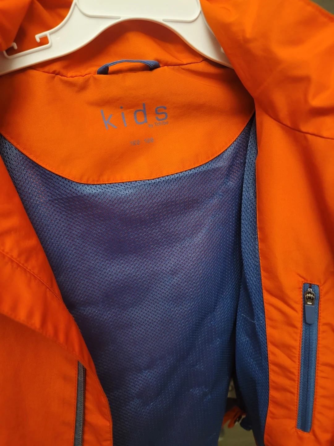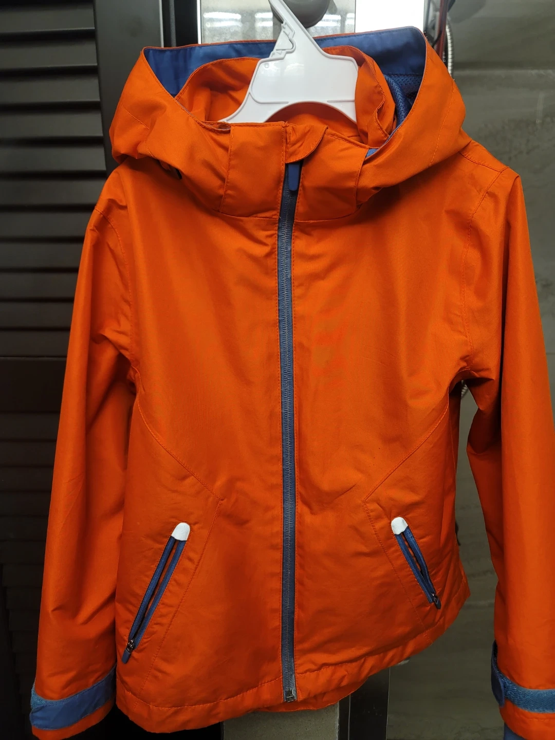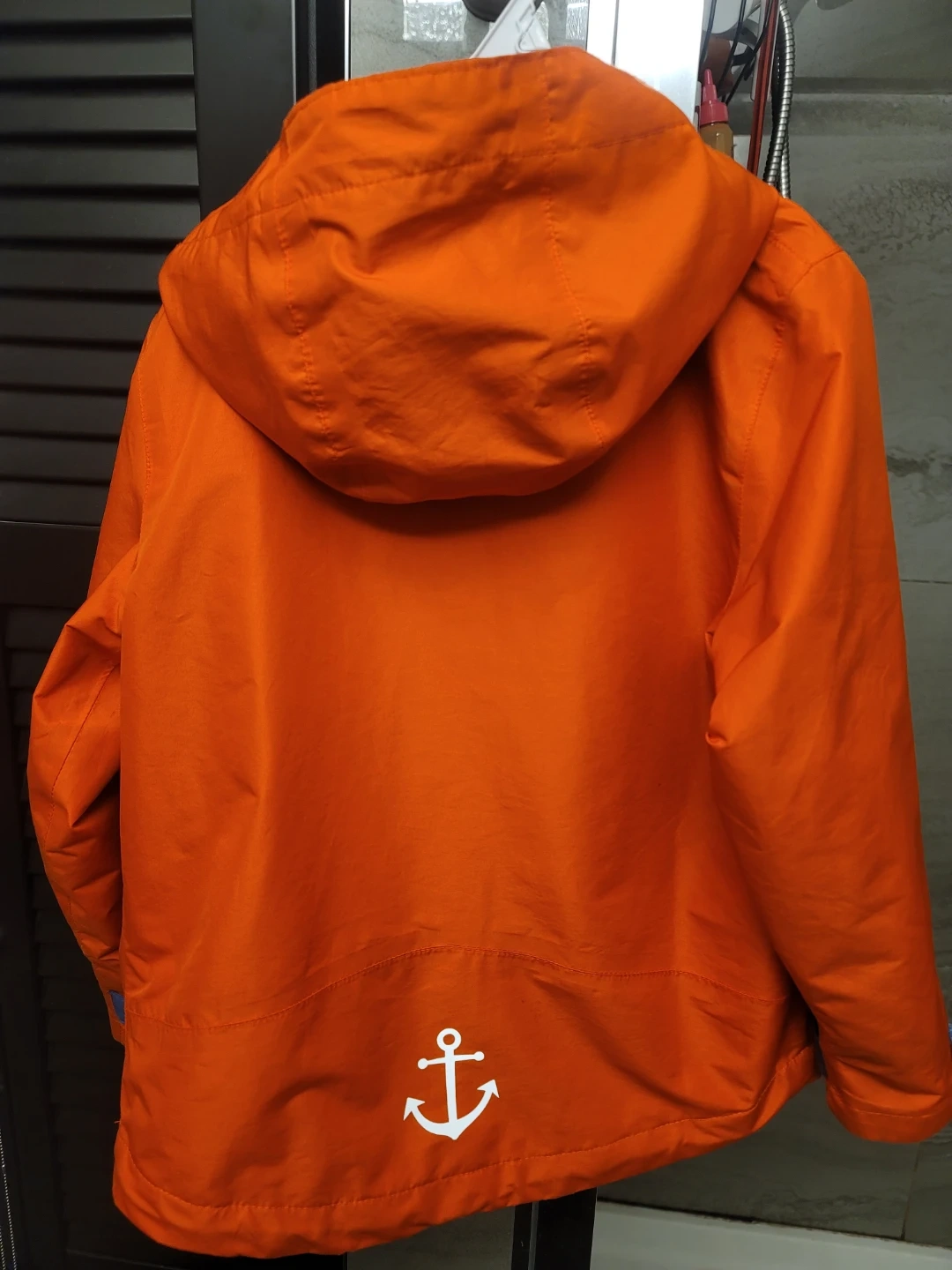 Selling a bright orange raincoat, perfect for keeping your little one dry on those rainy days! It features a hood and a zipper closure. It also has a cute anchor design on the back that's reflective