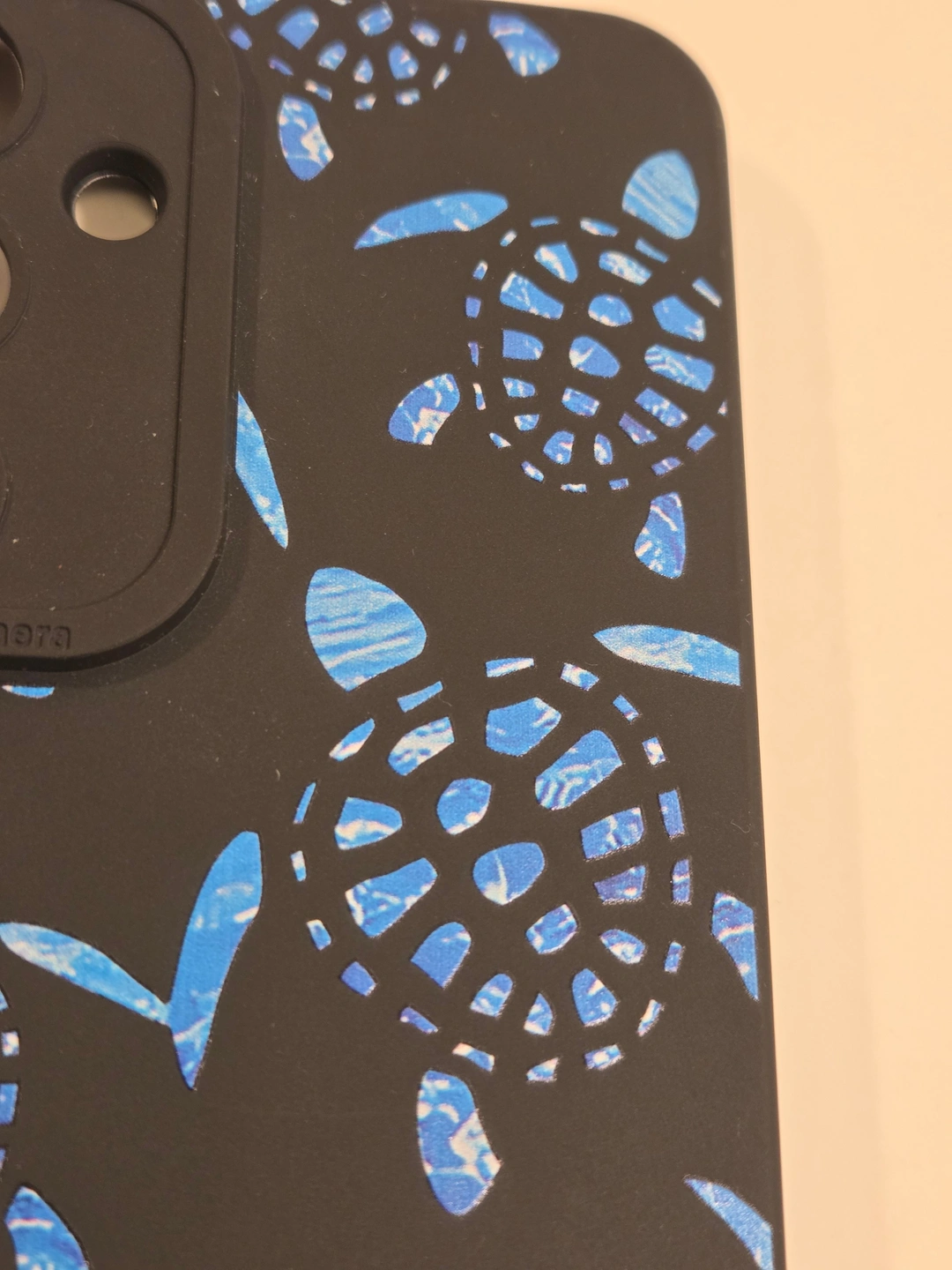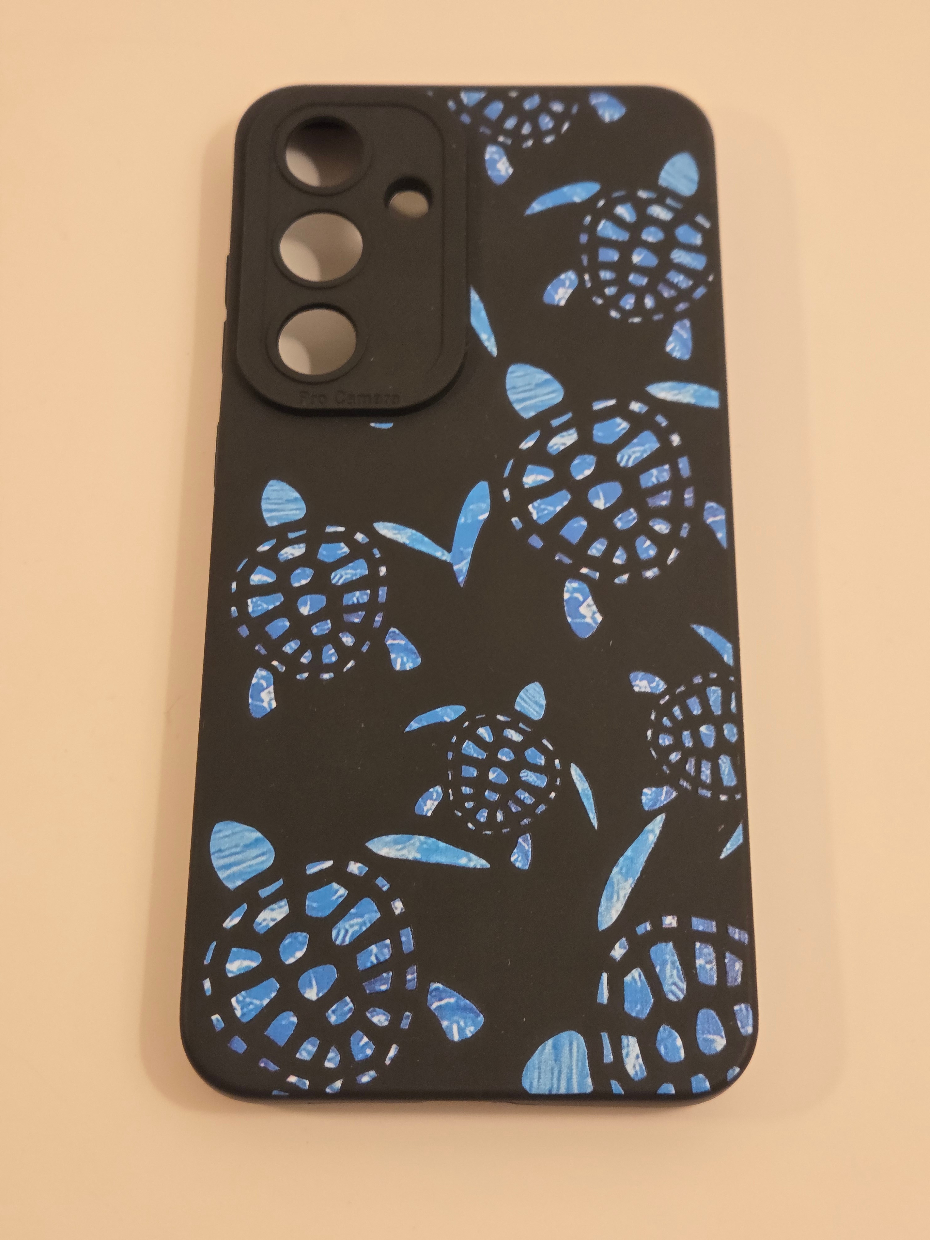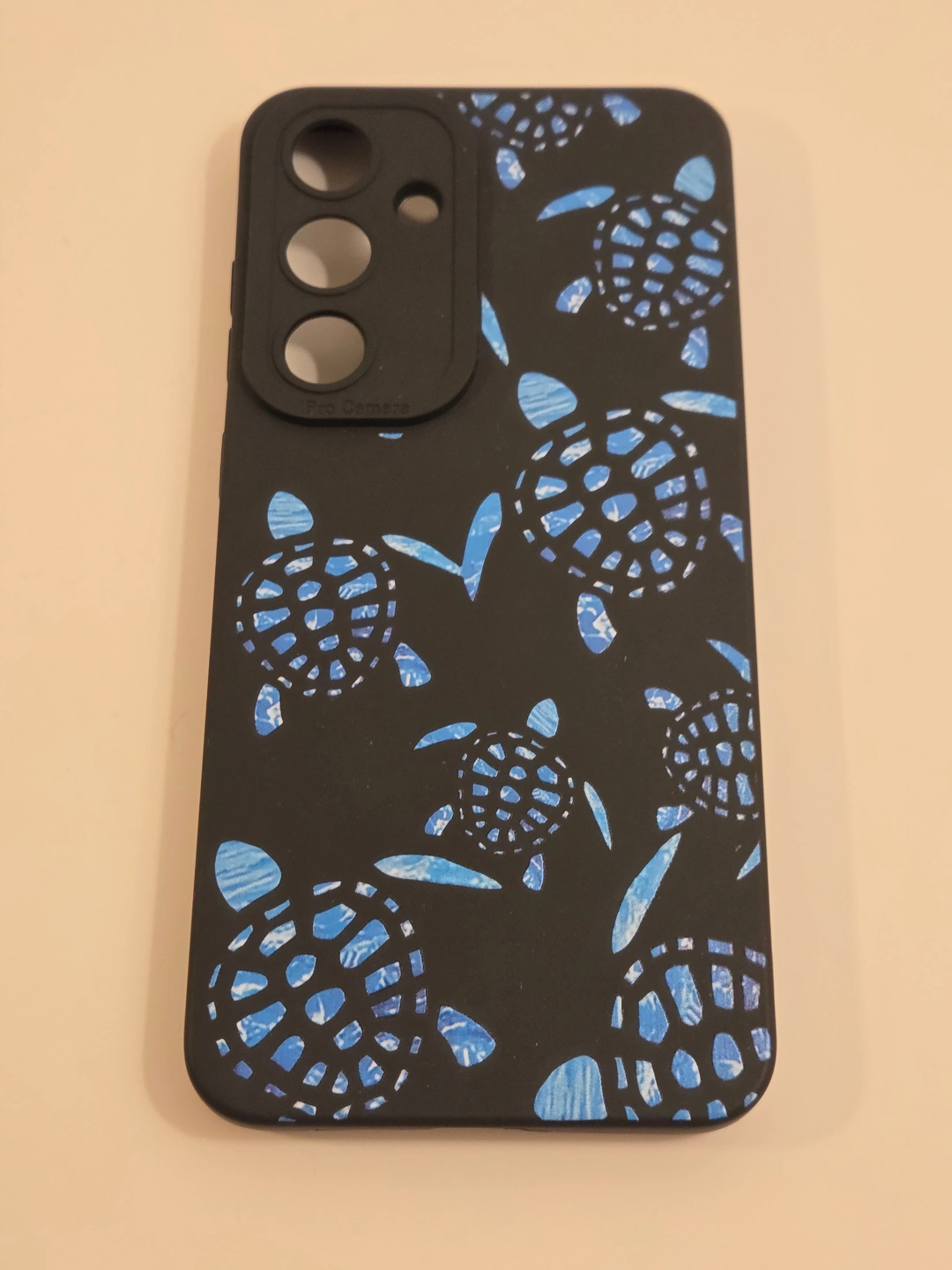Fun ocean-style case with blue sea turtle pattern. Soft-touch matte finish with a raised “Pro Camera” frame for extra lens protection. New, never used.