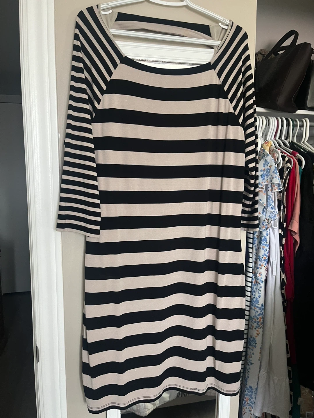 Selling a Kenar dress in size XL. It features a stylish black and beige striped pattern. Perfect for a casual day out or a comfortable evening at home