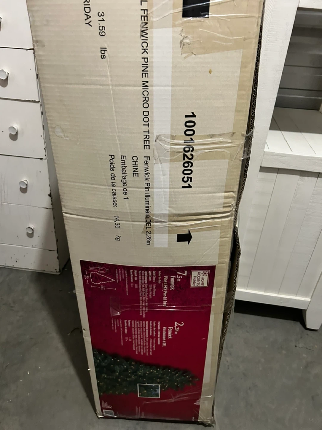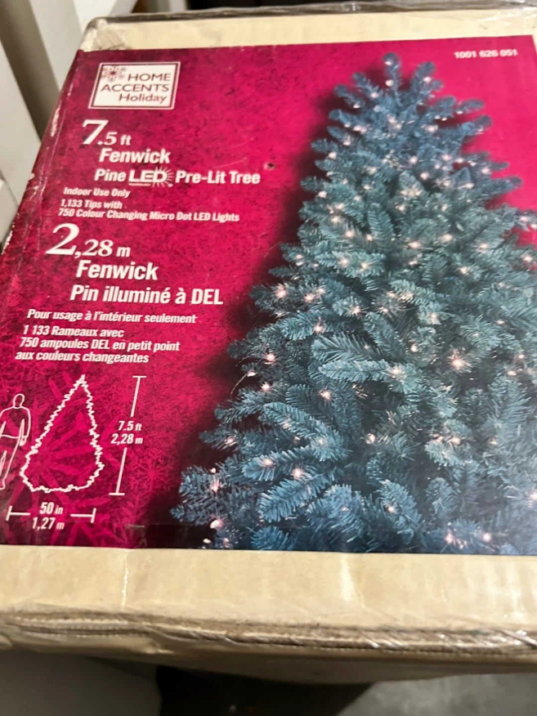 Selling a Home Accents Holiday 7.5ft Fenwick Pine LED Pre-Lit Tree! All 8 functions are working. It just requires some “fluffing”. It's indoor use only and comes with 1,133 colour changing micro dot LED lights. The tree is 2.28m (7.5 ft) tall and has a 50 in (1.27m) diameter at the base. Box included