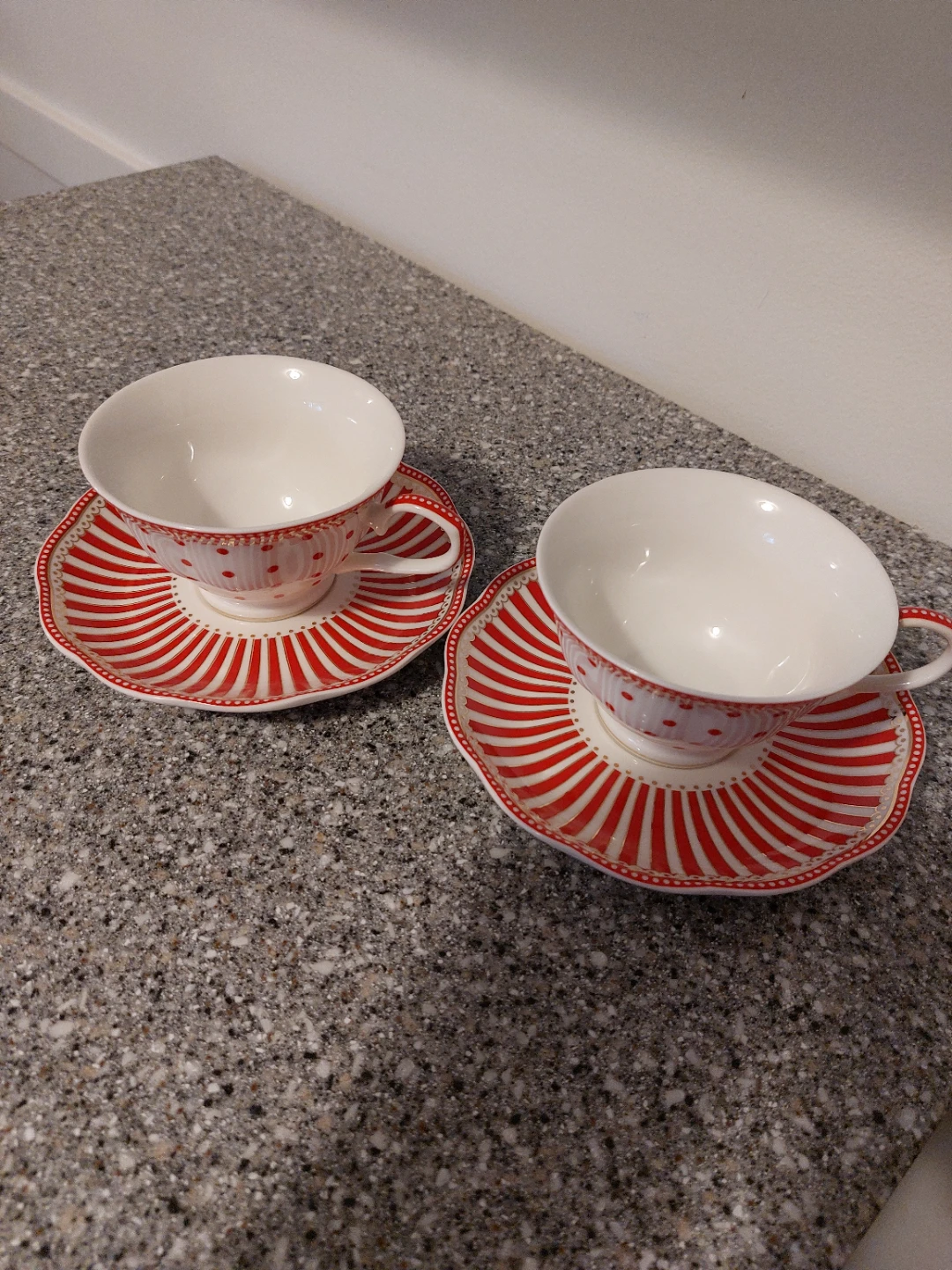 Selling a lovely Grace's Teaware cup and saucer set! This charming set features a delightful red and white polka dot and striped design. It's also dishwasher safe.