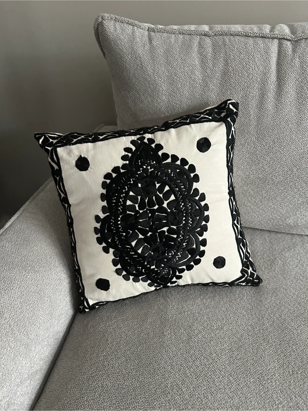 Here's a lovely decorative throw pillow for your home! It features a beautiful black embroidered design on a white background. It's in great condition and would add a nice touch to any couch or bed