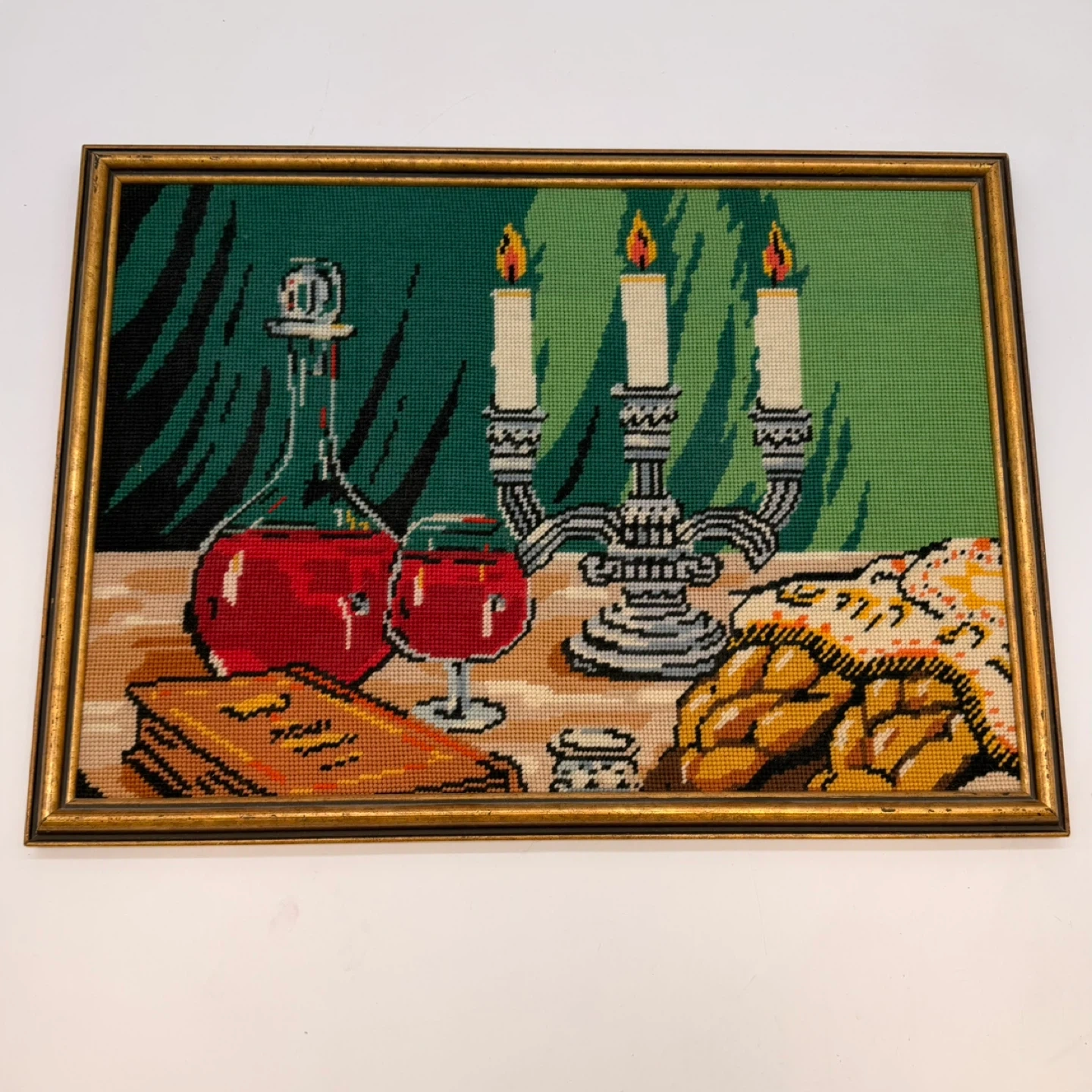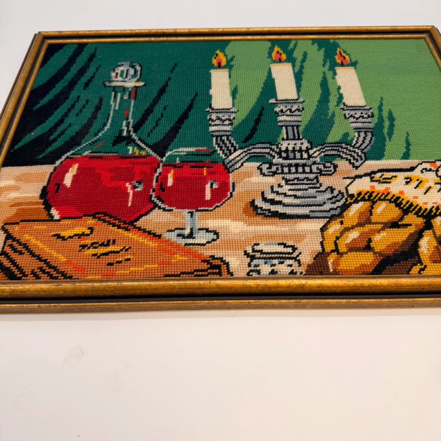 Beautiful vintage framed needlepoint wall art featuring a classic still life scene with wine bottles, glasses, candles, bread, and book. Rich colors and detailed stitching make this a great decorative piece for dining rooms, kitchens, or vintage-style interiors.