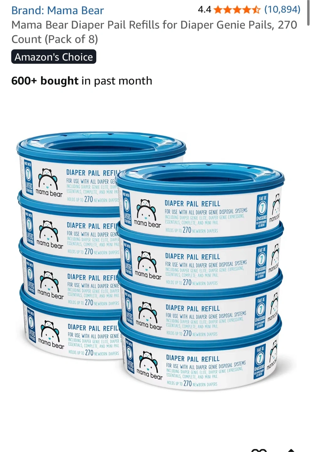 Keep your diaper pail fresh with these Mama Bear Diaper Pail Refills! This pack comes with 8 refills, each holding up to 270 newborn diapers. They're designed for use with all Diaper Genie disposal systems, including Elite, Essentials, Complete, and Mini pails. Makes diaper disposal a breeze!