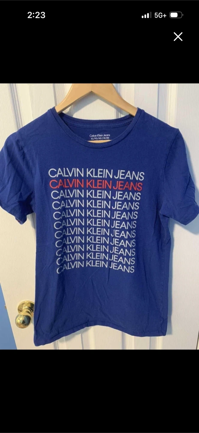Selling a Calvin Klein Jeans blue T-shirt in size XL (18/20). The shirt features the brand name repeated in a stacked design. It's in great condition and ready for a new wardrobe!