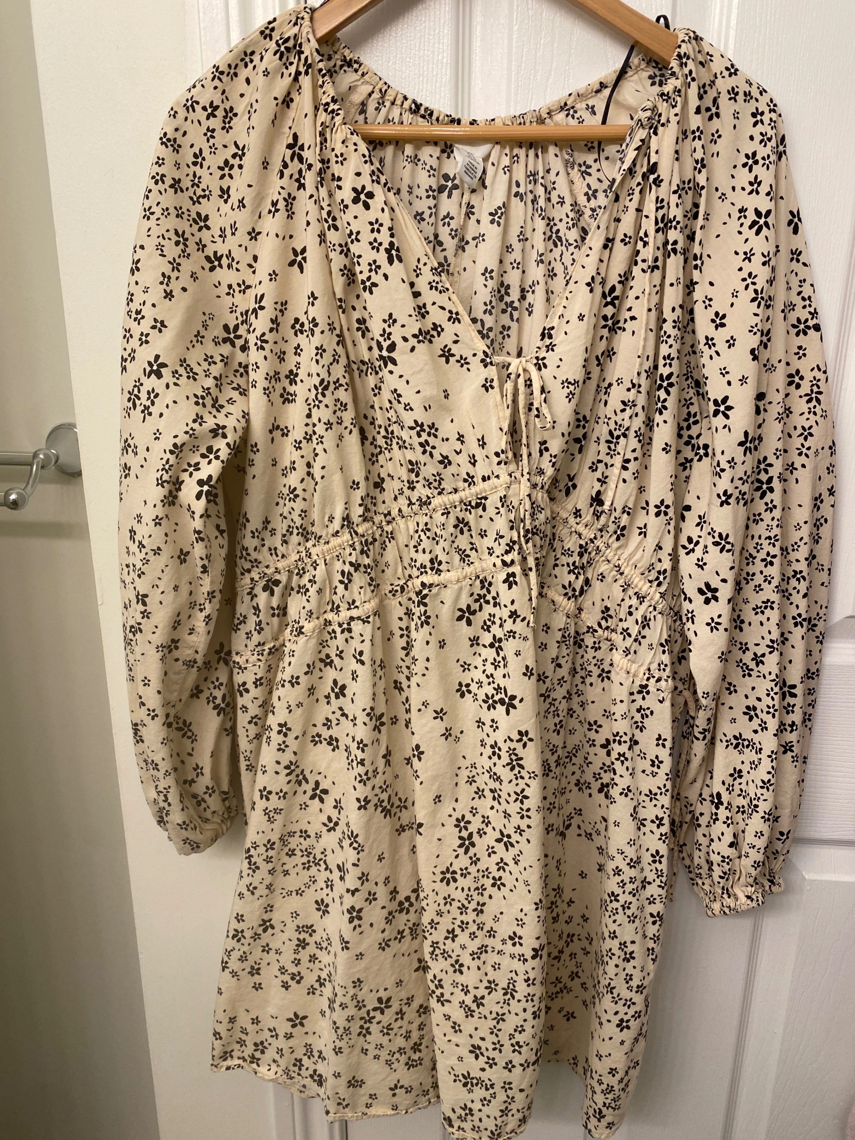 Selling a cute floral print dress! It features a V-neck with a tie and long sleeves. Perfect for a casual day out or dressing up for an evening event. It's in great condition and ready for a new home!